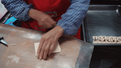 面团擀成薄薄的一大片,然后切成均等的长方形小块,在面片中间划一道小口,面片一端穿过小口再稍微拉长后就形成螺旋形。