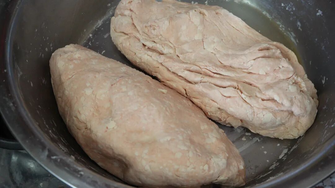 “鹅肠”好不好吃最关键的是面皮。首先备好面粉、猪油、白砂糖、水等材料,如果喜欢南乳风味的还可以加入南乳,然后分别配油粉和水粉,再混合揉搓一起成面团。