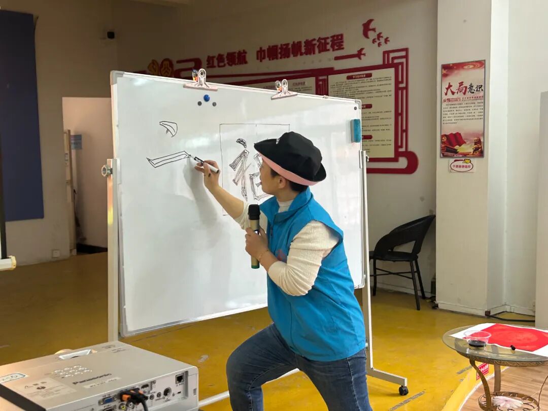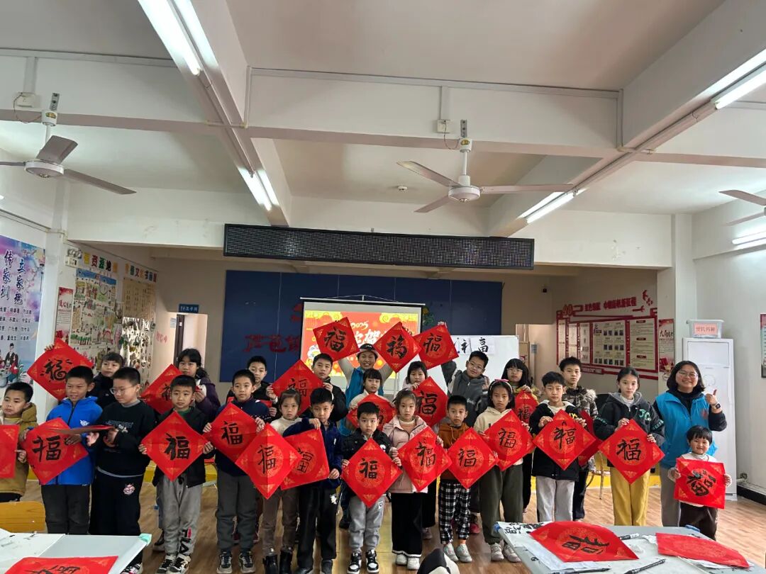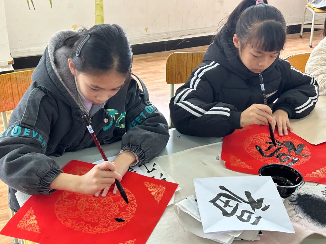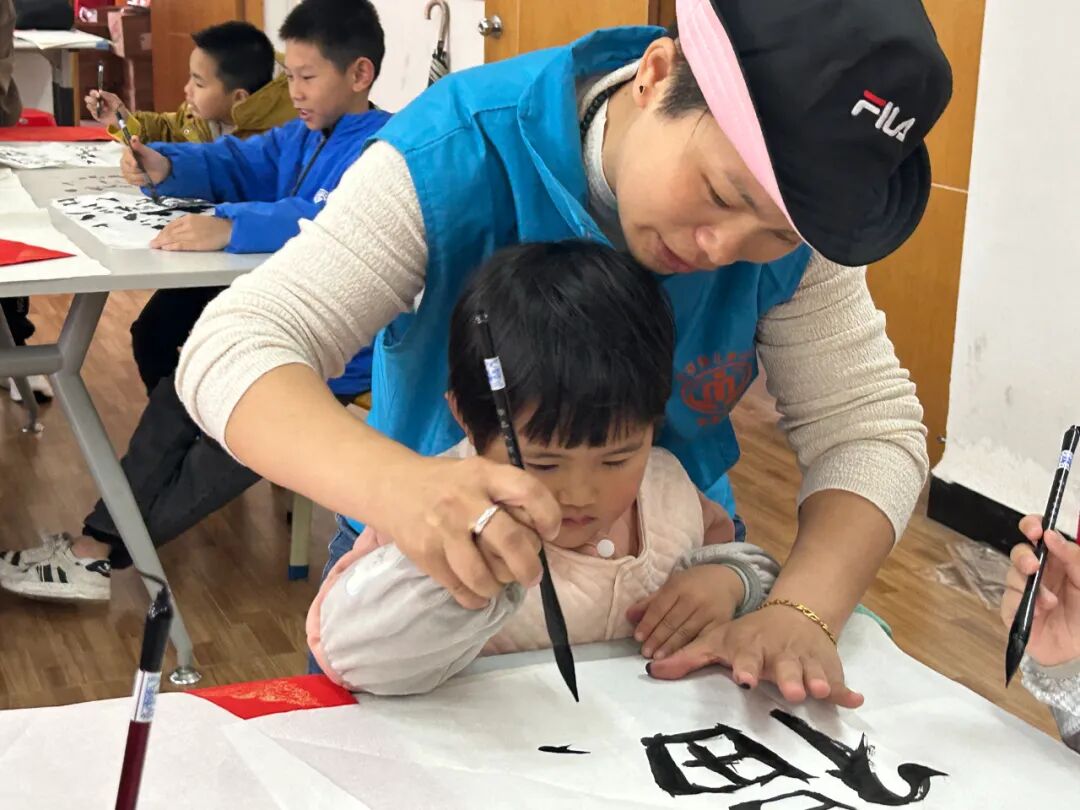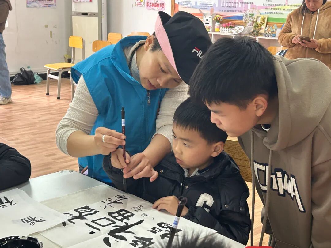 紧接着,书法老师唐老师登场,为孩子们开启书法艺术的大门。唐老师手持毛笔,深入浅出地讲解毛笔字的书写技巧,从握笔姿势、起笔收笔,到笔画的粗细变化、间架结构的搭配,每一个细节都讲解得细致入微。为了让孩子们更好地掌握,唐老师逐个笔画拆解分析,生动演示毛笔字的书写秘籍,一个苍劲有力的“福”字便跃然纸上。在练习过程中,唐老师更是耐心地走到每一个孩子身边,手把手地指导。有的孩子握笔姿势不对,唐老师轻轻握住孩子的小手,调整姿势,轻声说道:“握笔要稳,手指放松,这样才能灵活控制毛笔。”有的孩子笔画写得不够规范,唐老师便一笔一画地带着孩子重新书写,边写边提醒:“这个笔画要注意起笔重,收笔轻,这样写出来才更有韵味。”在唐老师的悉心指导下,孩子们逐渐找到了感觉,书写也越来越有模样。