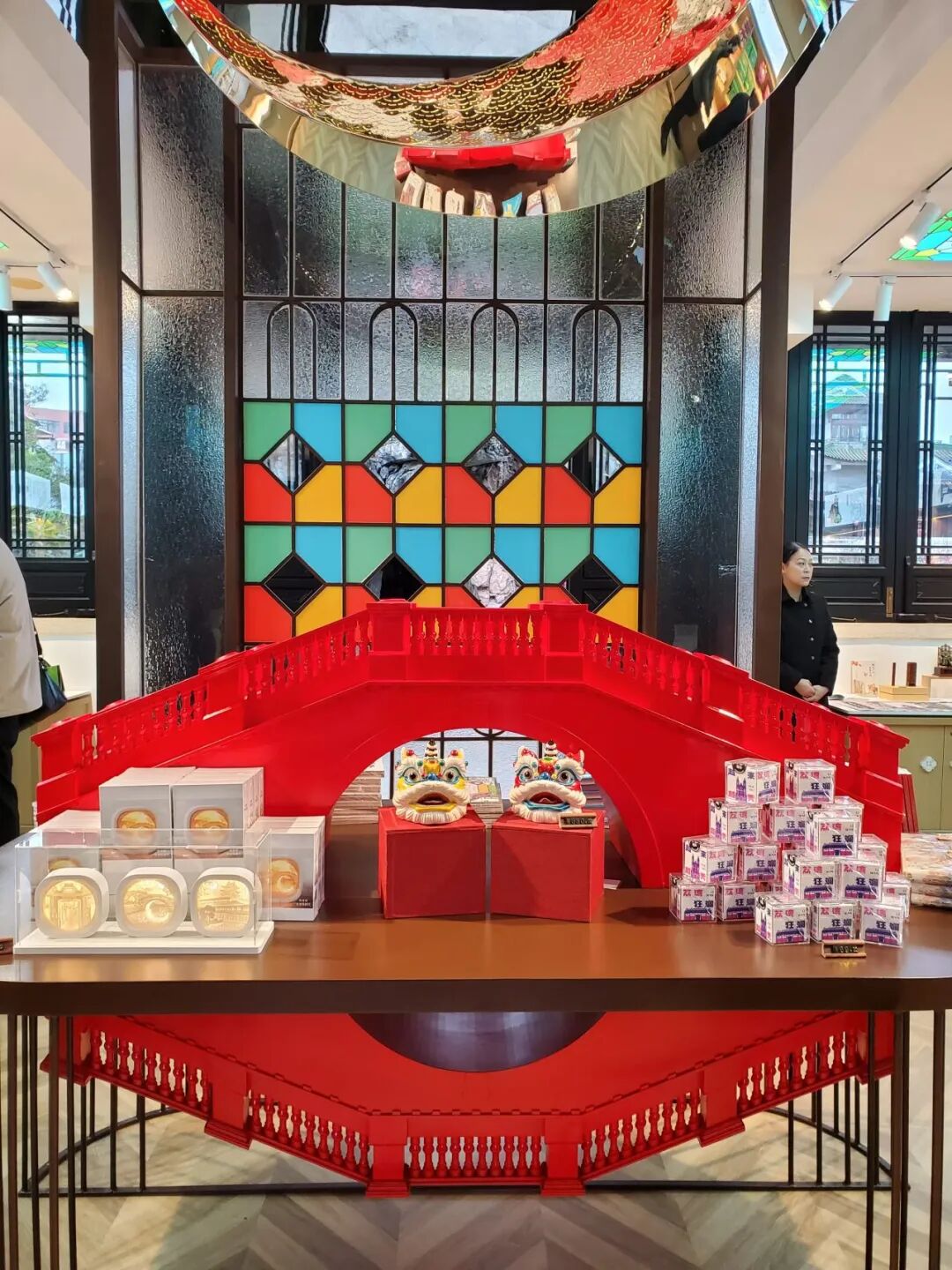 “荔湾礼物”旗舰店的设计同样亮眼,巧妙地将现代理念与传统元素相结合,以荔湾标志性建筑“月亮桥”为设计灵感,利用满洲窗、镜面相结合的镜框舞台概念跨界打造出室内月亮桥的艺术装置,与普天乐园林景观和建筑装饰呼应碰撞,营造出浪漫唯美的特色场景,人们置身其中,可以收获新奇美妙的游购娱多重体验。