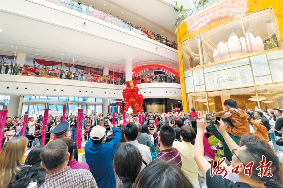 1月29日,海口国际免税城的舞狮表演颇受游人青睐。海口市融媒体中心记者 石中华 摄