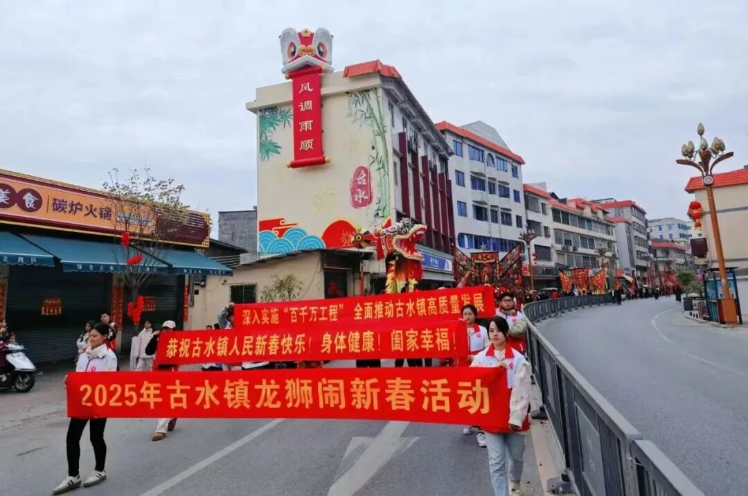 古水镇同样举办了春节龙狮大巡游活动。16支龙狮队伍在文体广场集结,通过精彩的武术、龙狮巡游展演,展现了古水人民昂扬向上、意气风发的精神面貌。现场锣鼓震撼、人山人海,龙狮矫健、神采飞扬,让游客们“零距离”感受当地民俗文化的独特魅力。