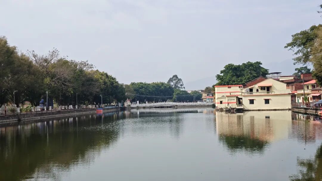 清澈的池塘水倒映着蓝天白云、绿树红花,