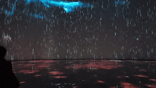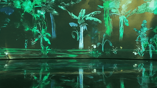 坐在这个沉浸式、多维度的数字展厅里,你可以穿过暮色苍苍的丛林,感受山风过耳;漫步于笔墨绘出的天地中,感受水流漫过……环绕式大尺幅幕墙的每一帧画面变化,仿佛人在画中游,大写的震撼!