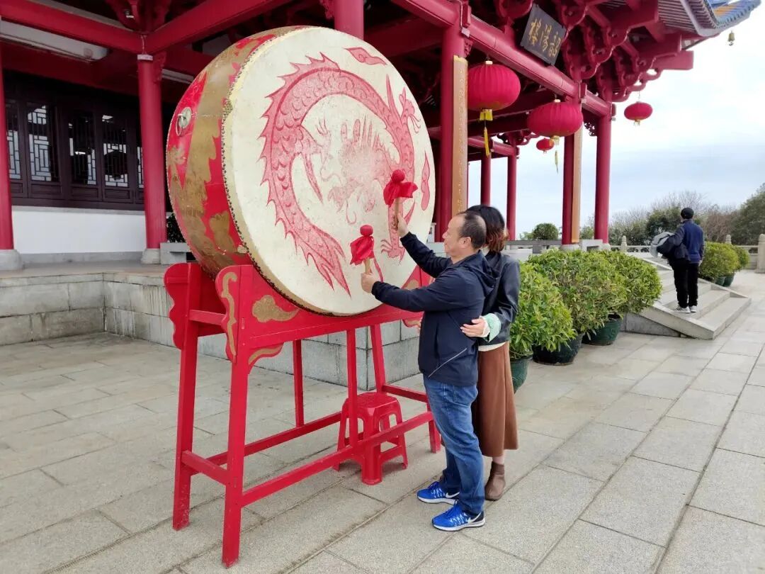 韶阳楼作为韶关标志性建筑之一,在春节期间成为了市民和游客们祈福迎新的热门打卡地。早早便有许多市民游客和家人朋友一起,沿着莲花山森林公园绿道,来韶阳楼登高远眺,走一个新年好运来。韶关市文化文物景点管理中心在韶阳楼大门前广场放置了一座大鼓,供市民游客前来击鼓祈福,人们每一次击鼓,都承载着对新的一年满满的祝福与期待。咚咚咚的鼓声,不仅唤醒了沉睡的城市,更敲开了人们心中对美好生活的向往之门。