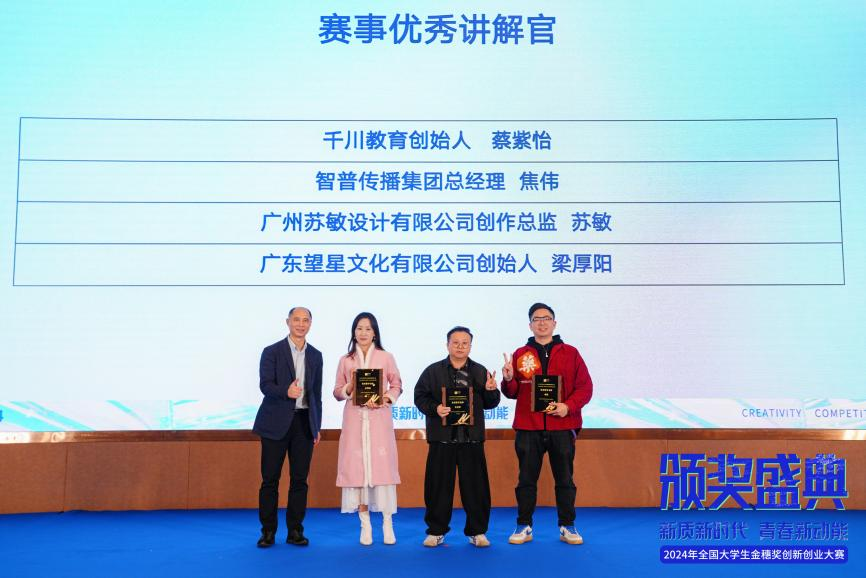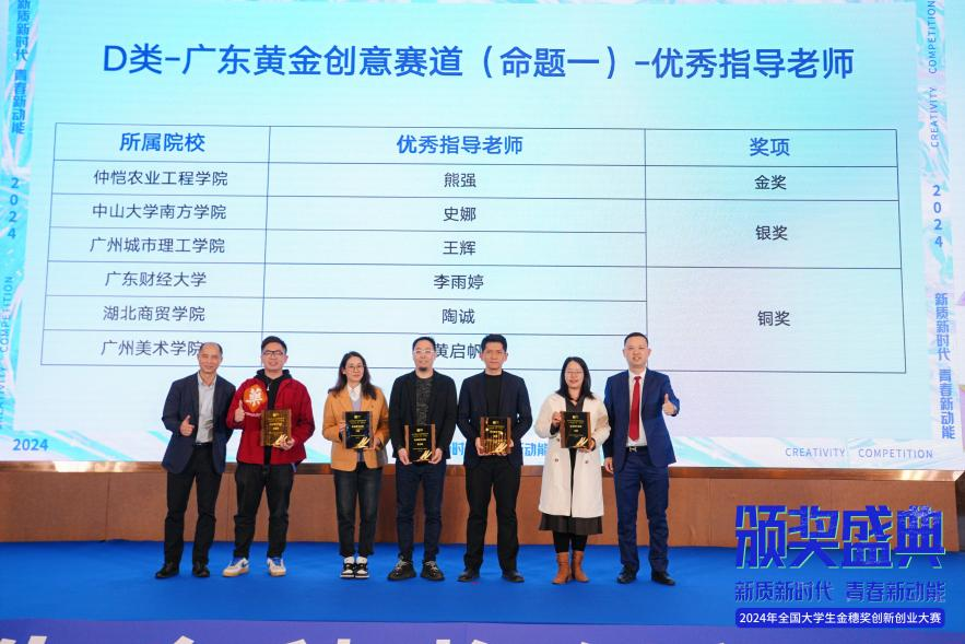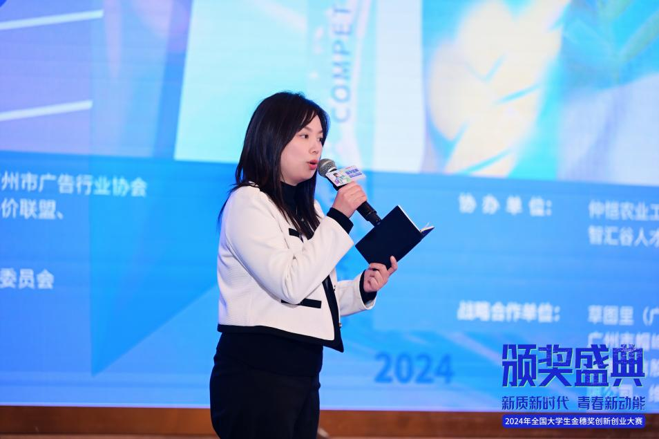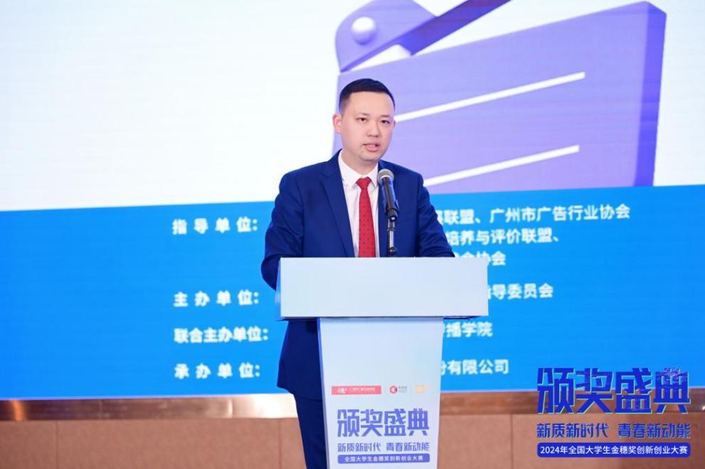 2025年1月15日下午,由广州市广告行业协会(以下简称“穗广协”)、全国农村产业融合发展联盟、广东省战略性产业人才培养与评价联盟、中国黄金协会、广东省黄金协会指导,大学生品牌建设与创新创意指导委员会(以下简称"大创会")主办,华南理工大学新闻与传播学院联合主办的“新质新时代 青春新动能”2024全国大学生金穗奖创新创业大赛颁奖盛典在广州圣丰索菲特大酒店隆重举行。