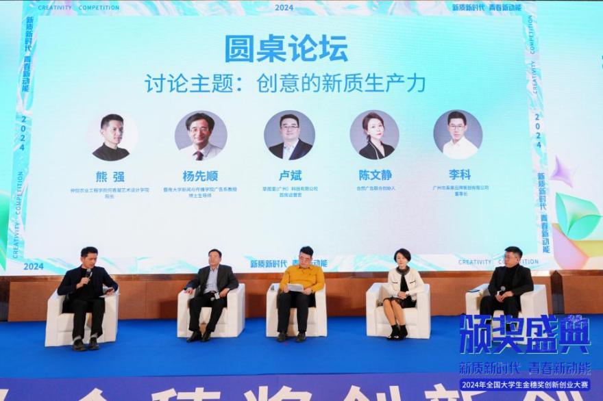 现场圆桌论坛环节由仲恺农业工程学院何香凝艺术学院副院长熊强担任主持,邀请到暨南大学新闻与传播学院广告系教授、博士生导师杨先顺,草图里(广州)科技有限公司首席运营官卢斌,合然广告联合创始人陈文静,广州市乘果品牌策划有限公司董事长李科,共同围绕“创意的新质生产力”进行专业深入的圆桌对话,深入探讨了“如何确保创意在追求创新的同时,坚守与平衡社会责任和道德底线”“创意的新质生产力给广告行业带来哪些变革和机遇”等议题,鼓舞大学生织就青春画卷,让青春之光芒,照亮追梦征程。