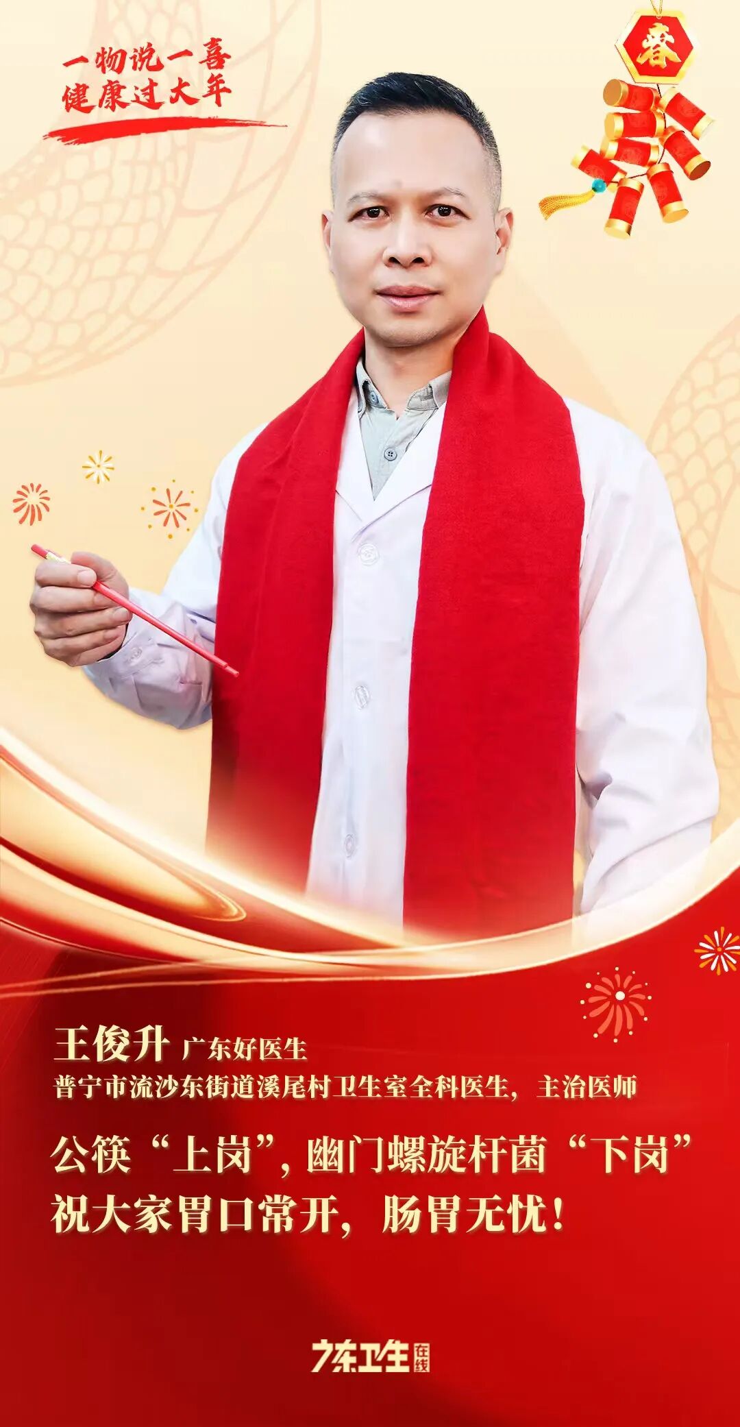 新春佳节之际,家家户户围坐餐桌,共享团圆之乐。普宁市流沙东街道溪尾村卫生室全科医生王俊升用一双小小的筷子,为大家送上健康过大年的温馨提醒。