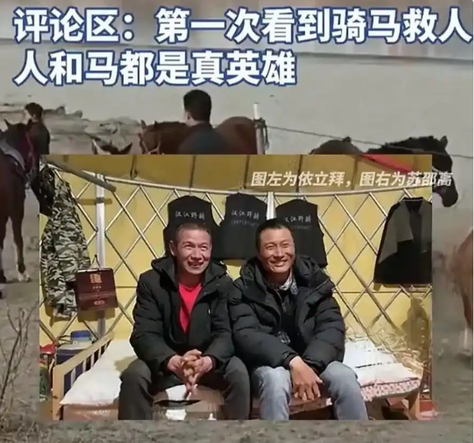 39岁的男子依立拜骑着一匹大白马冲入水中施救,在冬泳爱好者刘杭州的协助下,成功将落水男子救上岸。最终成功将落水男子救起。