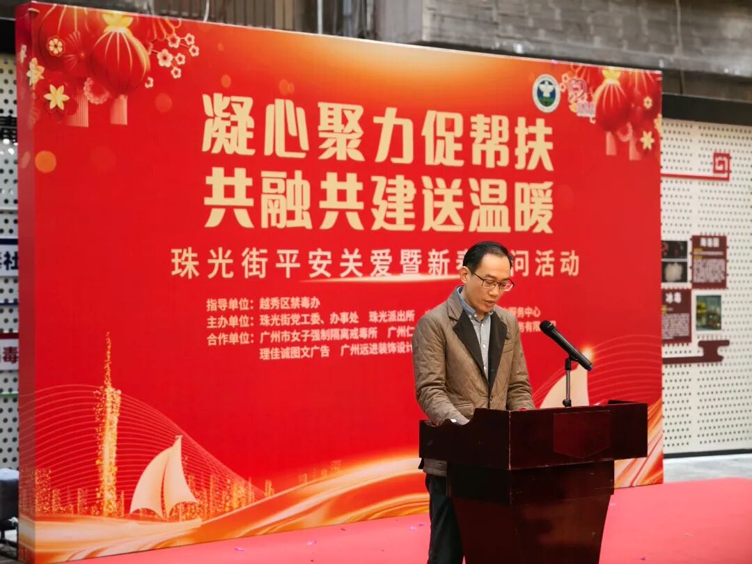 为积极推进“平安关爱”行动,切实做好戒毒康复人员关怀慰问工作,全面调动和凝聚社会力量,为戒毒康复人员提供多元化的帮扶与支持,助力他们顺利回归社会。2025年1月20日上午,在越秀区禁毒办的指导下,珠光街党工委、办事处联合珠光派出所、广州市女子强制隔离戒毒所、广州仁泰医院、广州市心明爱社会工作服务中心以及街道禁毒企业联盟等单位在珠光街禁毒主题公园共同开展了“凝心聚力促帮扶,共融共建送温暖”——珠光街平安关爱暨新春慰问活动。