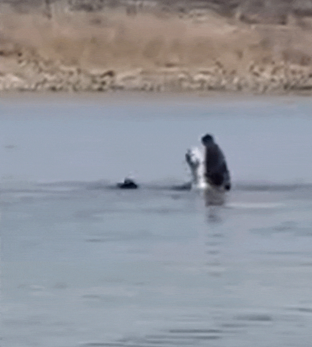 同一时间,冬泳爱好者刘杭州,听到呼救后也迅速跳入水中,游至男子身后,刘杭州和依立拜两人,一人拉、一人推,合力将落水男子救起。