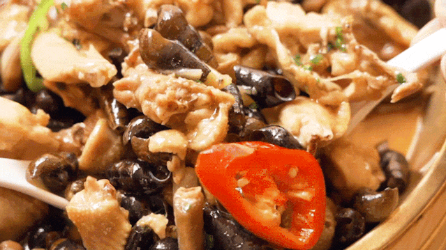 特色:山坑螺肉质紧实,搭配紫苏或与鸡肉同焖,鲜味十足。