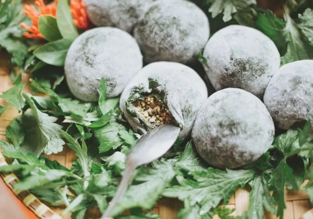 特色:艾草混合糯米皮,包裹花生芝麻馅,清香微苦,清明节前后最盛行。