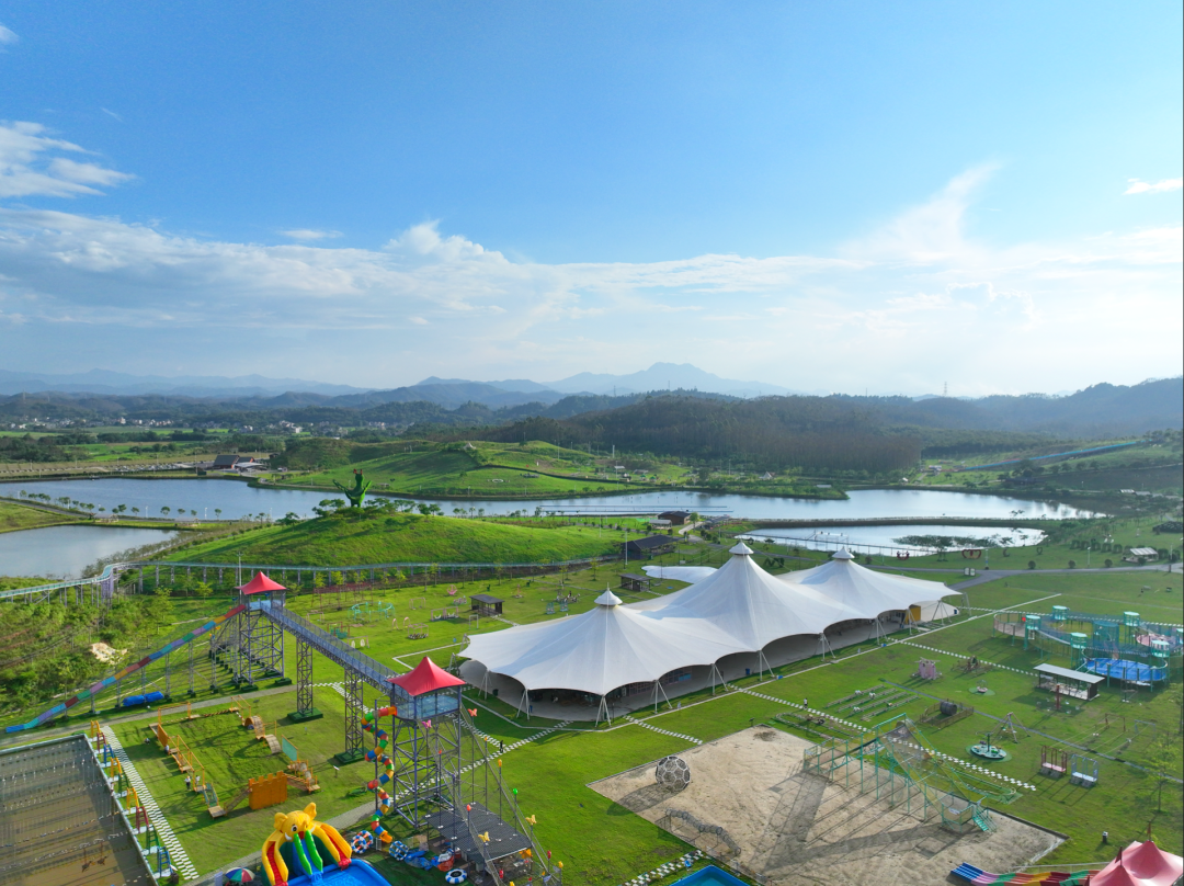 园区结合1000多亩草原、100多万株三角梅、20000多棵红花楹/蓝花楹/紫花风铃综合打造集乔、灌、草一体的三维立体景观。现已完成建设的一期包含水文化园、力学乐园、军乐园、农耕研学区、萌宠乐园、亲子乐园、声光电学园、综合服务区、草原、梦幻沙滩等项目。