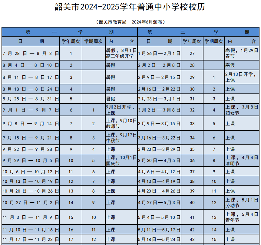 此前,韶关市教育局发布《韶关市2024-2025学年普通中小学校校历》,明确2025年2月13日(周四),全市中小学学生结束寒假正式开学上课。