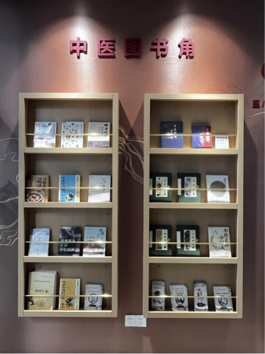 通过设置中医药健康养生、中医预防治疗常见病书籍的知识角,可以为候诊期间患者及其家属提供了解、认识和学习中医的阅读材料,缓解他们的焦虑情绪,更好地满足广大人民群众日益增长的医疗健康需求。中药药材展示柜摆放着十多种常见中药材,详细介绍药材的性味归经、主治功效,提高群众对中医药的认知度。