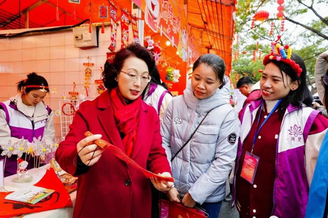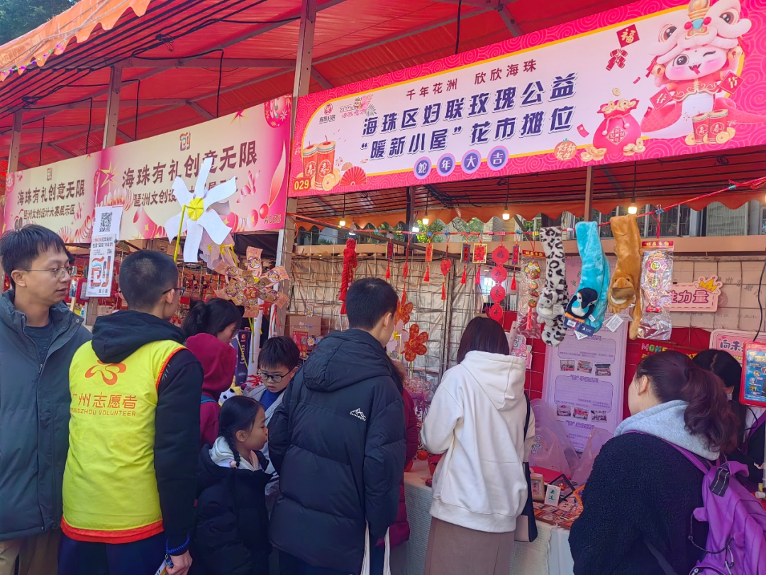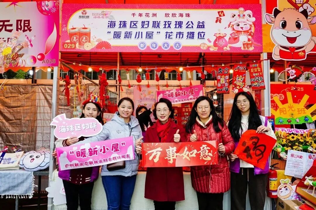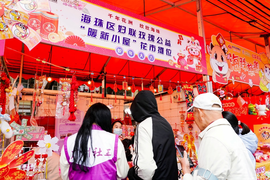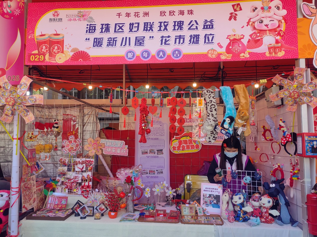 在海珠区妇联玫瑰公益“暖新小屋”花市摊位上,市民们不仅可以欣赏到精美的花卉和手工艺品,还可以通过慈善义卖活动,为新业态新就业妇女群体献上一份爱心。
