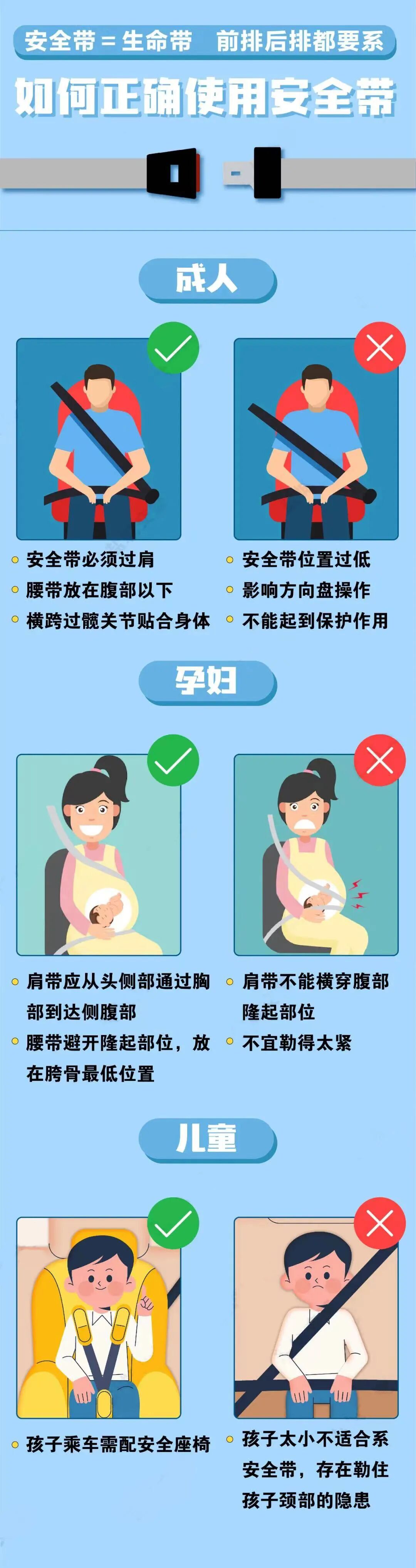 乘坐机动车时不论在前排、后排,还是高速、低速,一定要“全程、全员规范系好安全带”。对于年龄尚小的儿童,还需配备适应其身高的儿童安全座椅或增高垫。