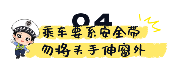 ☞乘车时,同学们要听从随车照管人员安排,乘车系好安全带,切勿随意将头、手等身体部位伸出窗外,更不要在车内打闹嬉戏或者和司机师傅聊天。