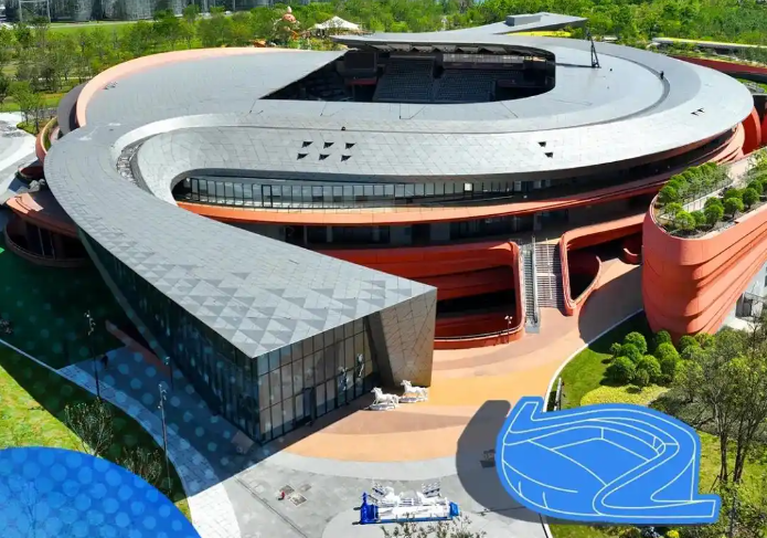 上海久事国际马术中心的设计理念以“马术谷”为核心,整体造型独特,上部“Ω”形建筑形体由银色金属结构构成,轻盈灵动,起伏的园景和蜿蜒的游廊营造出一种梦幻般的氛围。建筑的每一处细节都充满了创意和诗意,从通体砖红色的连绵建筑外墙到场馆内外墙面、地面以及扶手上的“马蹄印”设计,无不体现出对马术运动的热爱与敬意。