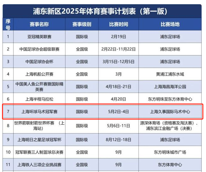 第一赛马网获悉,上海浦东新区区委宣传部(区文体旅游局)近日公布2025国际国内体育赛事计划,近30项国际级、全国级、全区赛事预计年内在浦东举办。其中,备受瞩目的上海浪琴环球马术冠军赛将于“五一”假期震撼回归,亮相国内首座符合国际五星级赛事标准的专业马术比赛永久性场馆——上海久事国际马术中心,重现“上海之跃”的精彩瞬间。