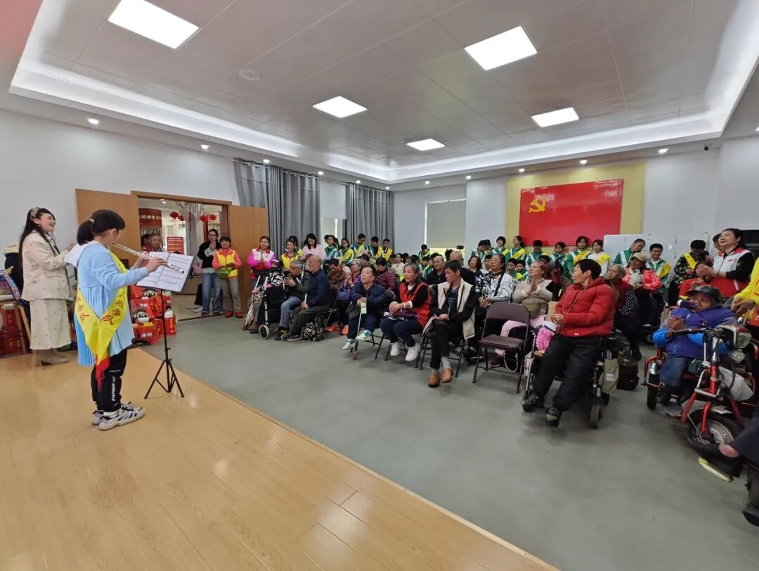 随后,志愿者们引导长者回到党群服务中心。在此,学生们表演了舞蹈、歌曲等节目,为长者们带来了欢乐与惊喜。长者们也积极参与其中,民哥与主持人苏红合唱歌曲。赵广军生命热线协会真情关爱歌舞队志愿者与同学们带来手语舞《感恩的心》,全场一起跟着舞动双手,都被这份真挚的情感所感染,欢声笑语不断。