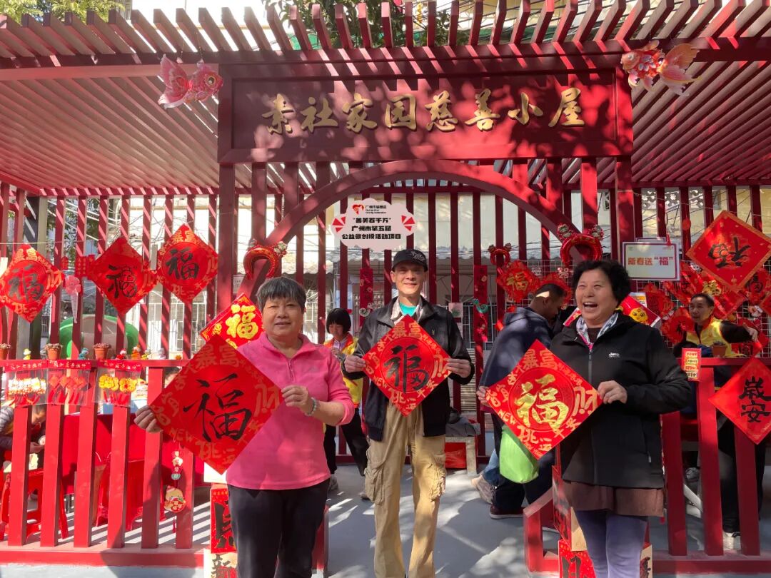 春节期间,通过“善美百千万”广州市第五届公益微创投活动落地实施的素社家园慈善小屋焕然一新,精致的中国灯笼、喜庆条幅与随风摇曳的祈愿牌相互映衬,充满浓浓的年味与温情。小屋内,书法家们挥毫泼墨,笔锋游走间,为街坊邻里送“福”。慈善大使园园与财神爷热情地与居民互动、拍照,现场欢声笑语此起彼伏。