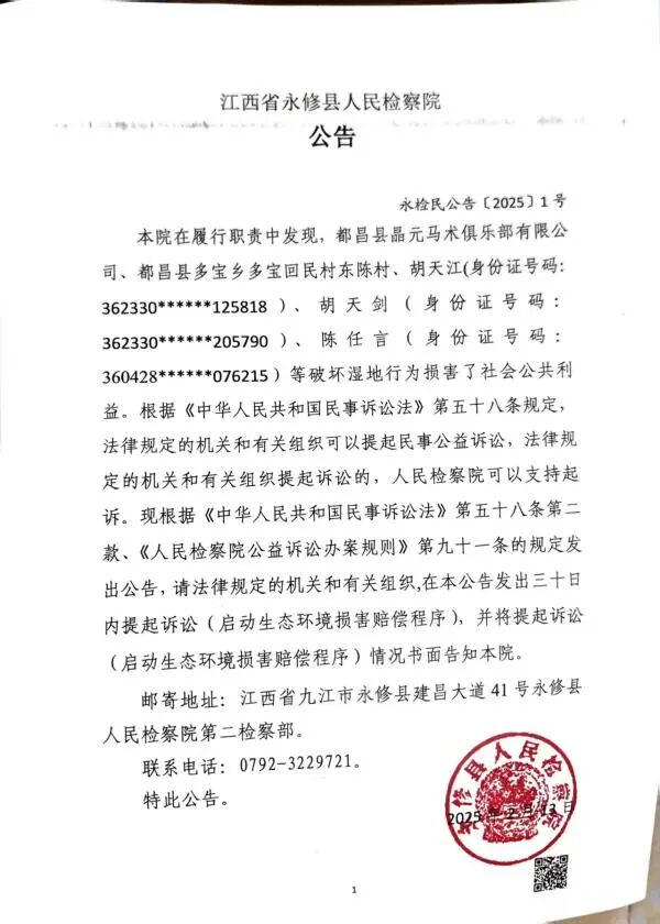根据法院公告所示,江西省永修县人民检察院在履行职责中发现,都昌县晶元马术俱乐部有限公司、都昌县多宝乡多宝回民村东陈村、胡天江(身份证号码:362330******125818)、胡天剑(身份证号码:362330******205790)、陈任言(身份证号码:360428******076215)等破坏湿地行为损害了社会公共利益。根据《中华人民共和国民事诉讼法》第五十八条规定,法律规定的机关和有关组织可以提起民事公益诉讼,法律规定的机关和有关组织提起诉讼的,人民检察院可以支持起诉。