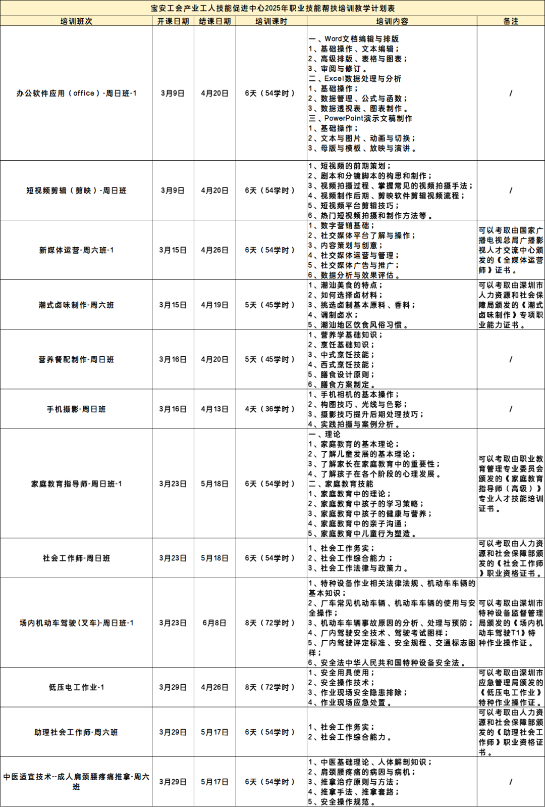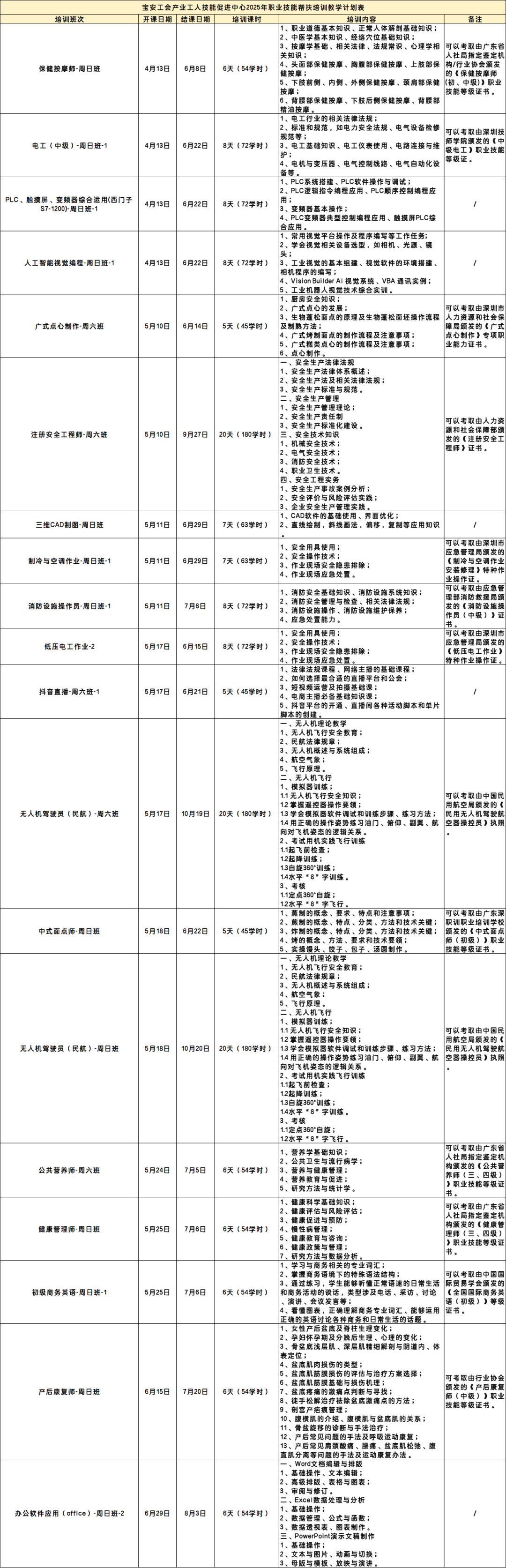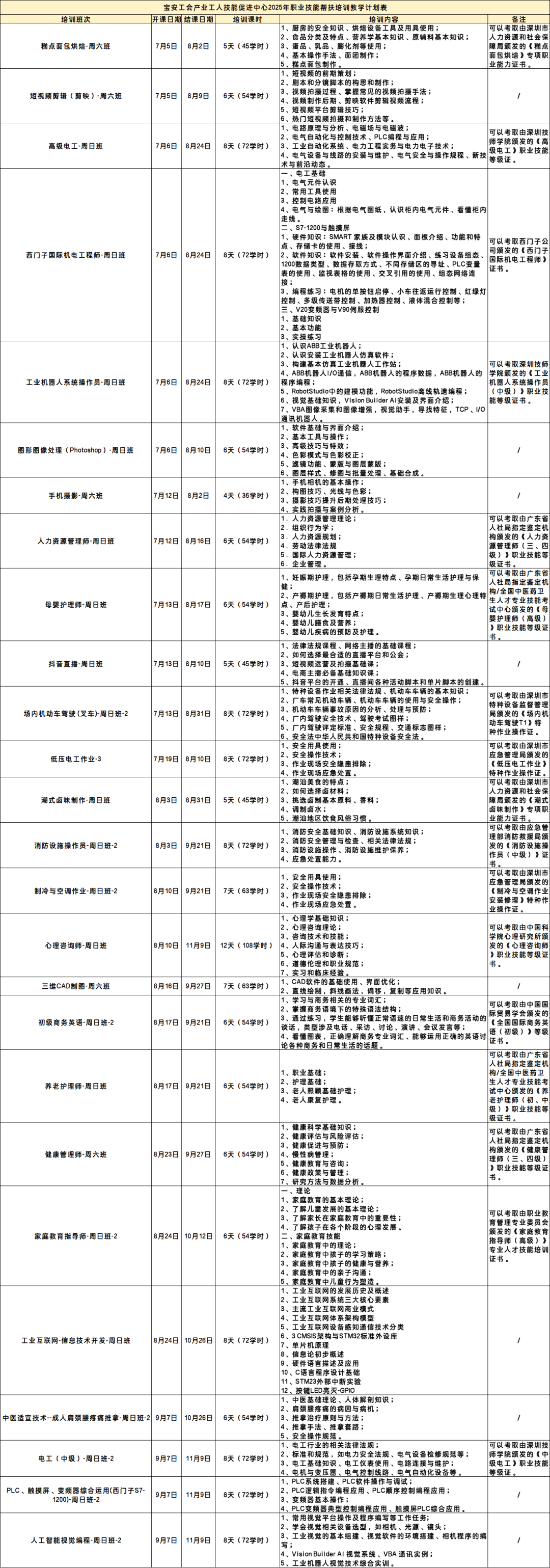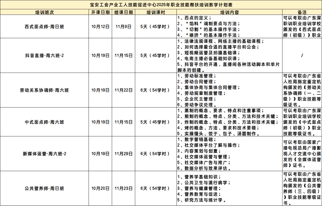 4.以上全年招生计划会根据实际招生情况进行实时调整,课程具体开课时间、课程内容设置请以宝安工会产业工人技能促进中心最新公示宣传与答复为准。