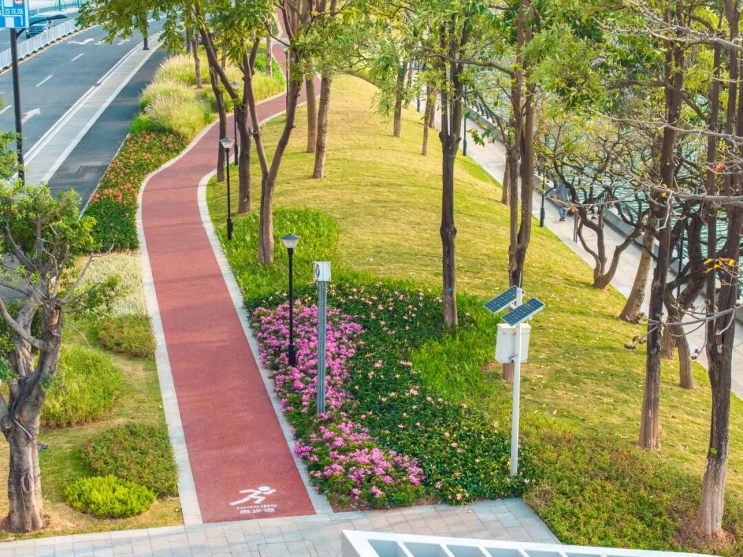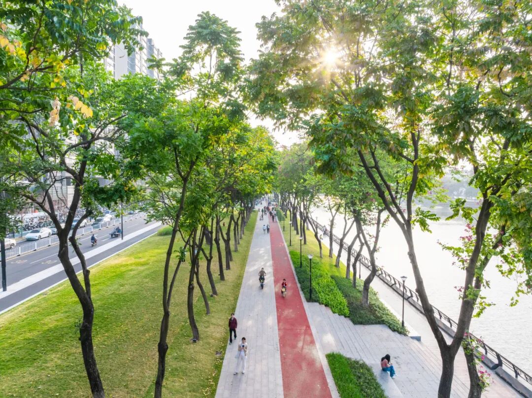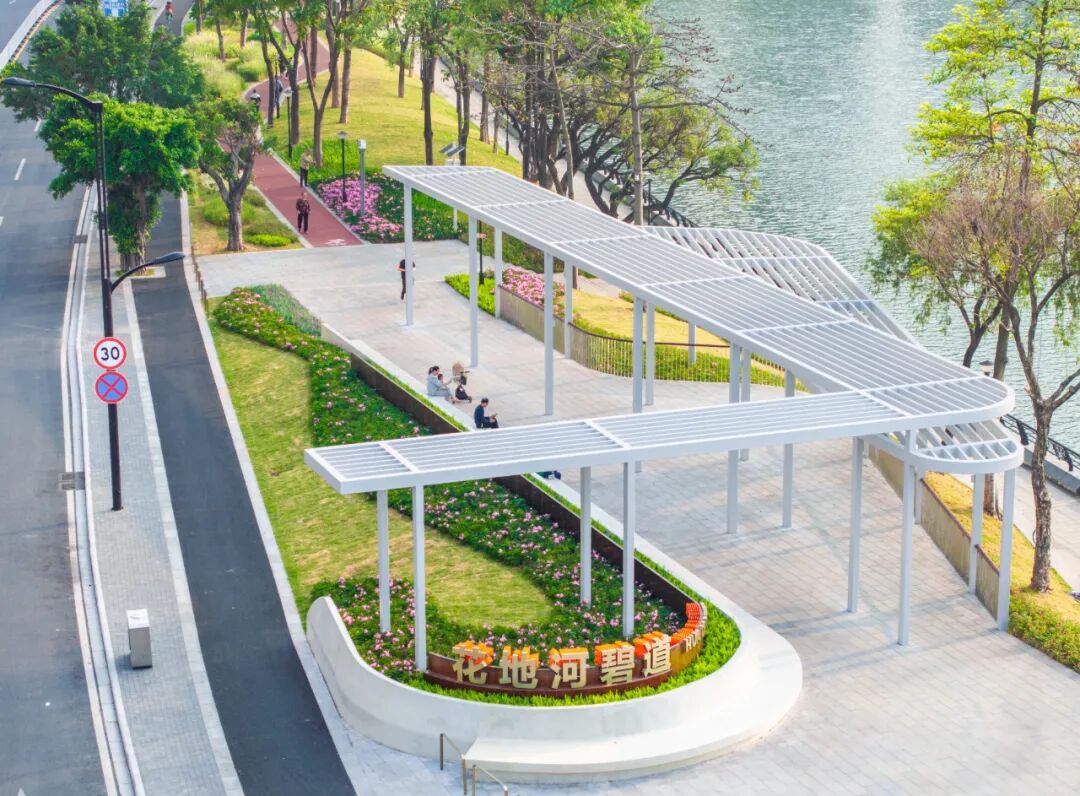 以人为本,满足人的需求,是花地河示范段滨水环境整治工程的出发点和落脚点。工程重点完善沿线配套设施,新建标识入口、文化广场、游乐空间,补充城市家具、碧道标识、安全警示牌,增加沿线功能性照明,补充休息停留区,新增7处滨水休息廊和18处一体化休闲台阶,提升碧道公共服务能力和属性,提供全龄段、全天候户外活动空间。通过绿地空间弥补活动配套,衔接临水社区,强化水岸联系。此外,荔湾区正在积极谋划推动花地河水上运动项目,大力发展花地河绿色水经济,探索河湖生态价值转化新路径。