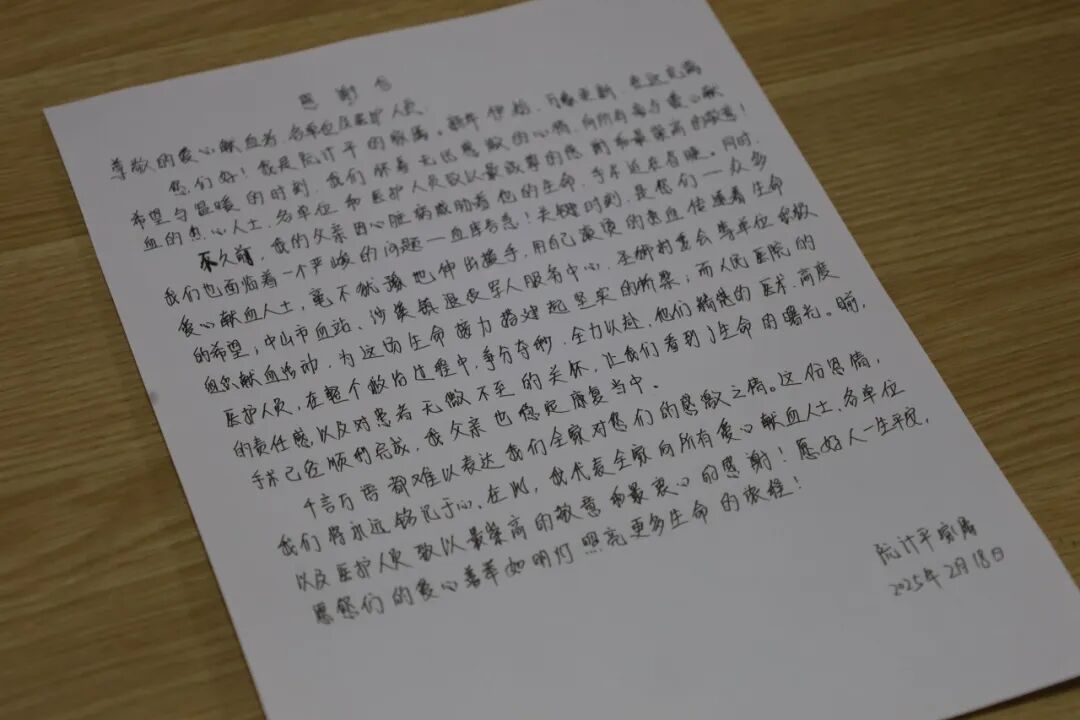 不久前,我的父亲因心脏病威胁着他的生命,手术迫在眉睫。同时,我们也面临着一个严峻的问题——血库告急。关键时刻,是您们——众多爱心献血人士,毫不犹豫地伸出援手,用自己滚烫的热血传递着生命的希望;中山市血站、市镇宣传部门、沙溪镇退役军人服务中心、圣狮村委会等单位积极组织献血活动,为这场生命接力搭建起坚实的桥梁;而人民医院的医护人员,在整个救治过程中,争分夺秒、全力以赴。他们精湛的医术、高度的责任感以及对患者无微不至的关怀,让我们看到了生命的曙光。