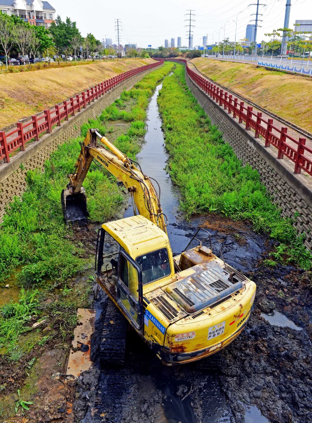 据了解,大布迳河河涌整治工程下至天马支渠河口,上至红棉大道北和花都大道路口,治理总长度为6.29km,按照20年一遇防洪标准进行整治,大布迳河河涌整治工程工期为660天,项目估算总投资26877.93万元。该工程将通过新建堤防及堤岸加高、阻水桥涵治理、新建泵站、新建水闸、河道清疏、巡河通道建设等方式进行。当天开展的是河道清疏工作,采用水陆挖机进行清淤作业,确保清淤深度和河床平整。