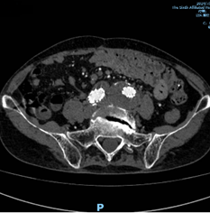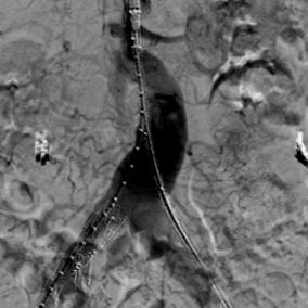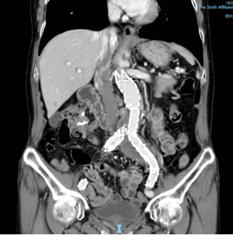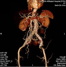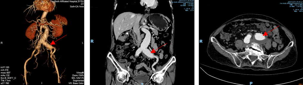 术前CTA重建提示:腹主动脉远段、双侧髂总动脉、左侧髂内动脉管腔扩张,左侧髂总动脉瘤最大直径超过42mm。