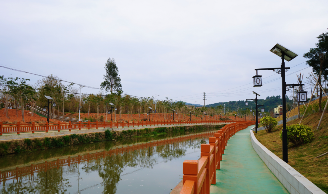 公园沿河种植了特色绿植,铺设草皮,