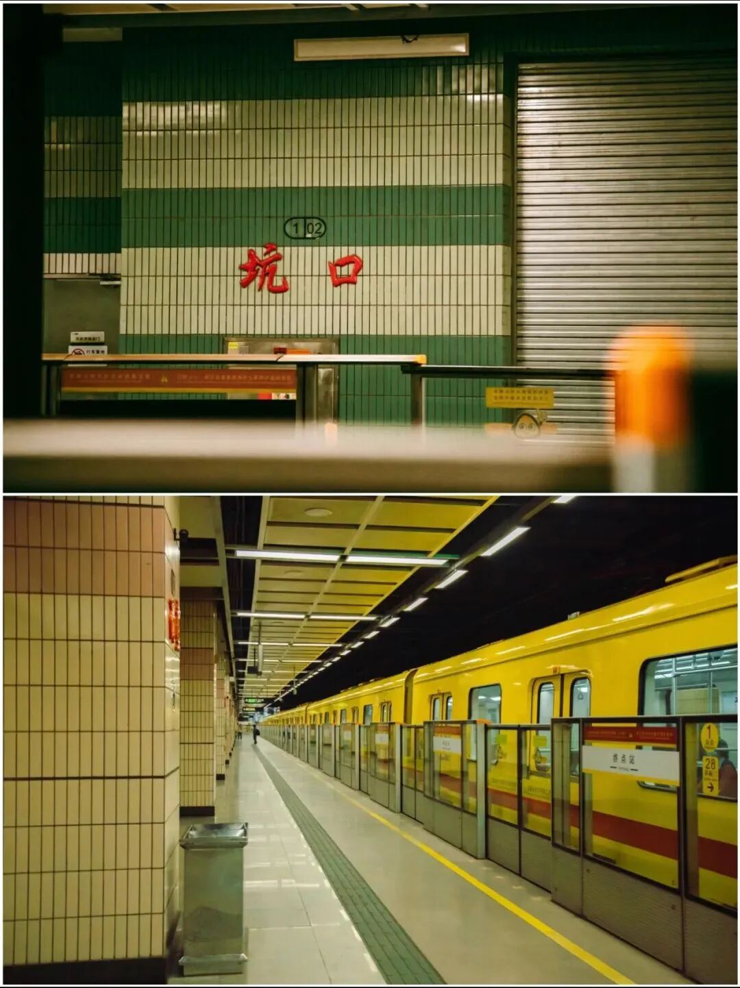 步行几分钟来到坑口地铁站。一踏入,有电影感的装潢让人立马驻足下来,站内采用大量绿色长条拼接墙面,没有过多的科技感,但独有风味,好看又好拍。站台两端可以看见露天列车正在穿越轨道,像承载着旧时记忆与新的希望一般,日夜兼程。