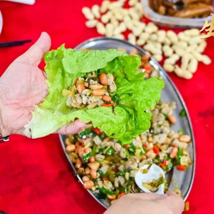 ·生菜包:用生菜叶包裹韭菜、蚬肉、萝卜干、酸菜炒蚬肉、粉丝等食材,沾上辣椒酱后食用。