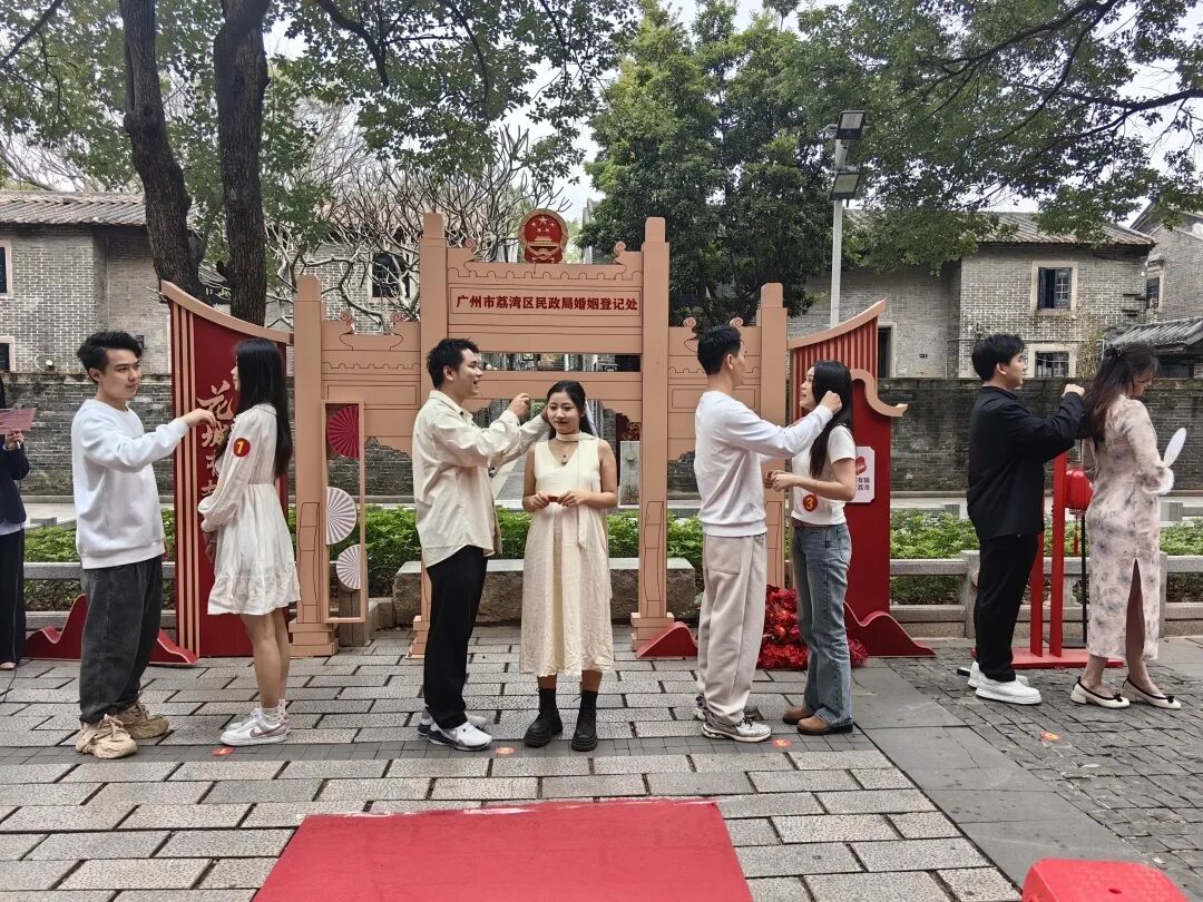 2月22日,荔湾区民政局在荔湾聚龙古村户外颁证点举行“花城有囍·缘定荔湾·永结同心”户外集体颁证活动。随着4对新人跨过花生、生菜迈向颁证舞台,集体对拜、合卺之礼、大婚礼成……一场中式婚礼将中国传统文化的韵味和魅力演绎出来。此外,荔湾区民政局设置了婚扇制作环节,新人们沉浸式创作,精心制作自己的专属婚扇,感受幸福甜蜜的一刻。