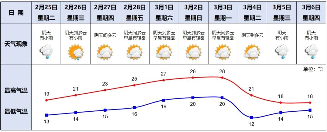 2月25日,阴天,有小雨,13~19℃,相对湿度60~95%;26日,阴天到多云,有小雨,14~21℃;27日,阴天间多云,15~23℃。(荔湾区气象台2月24日17时发布)