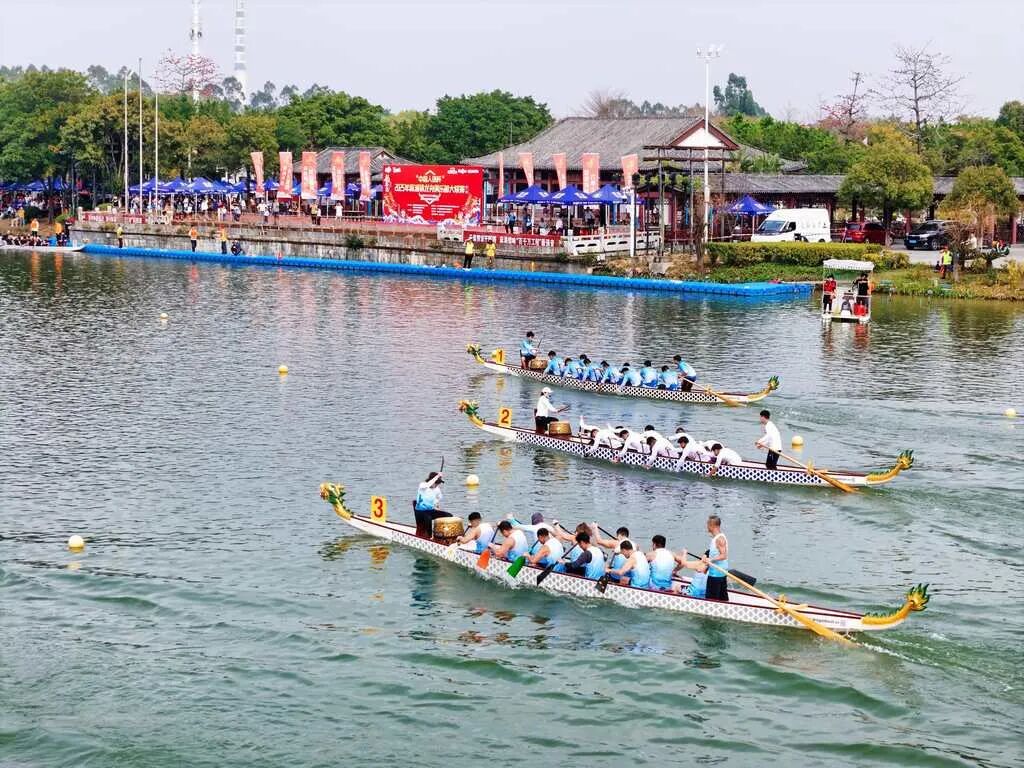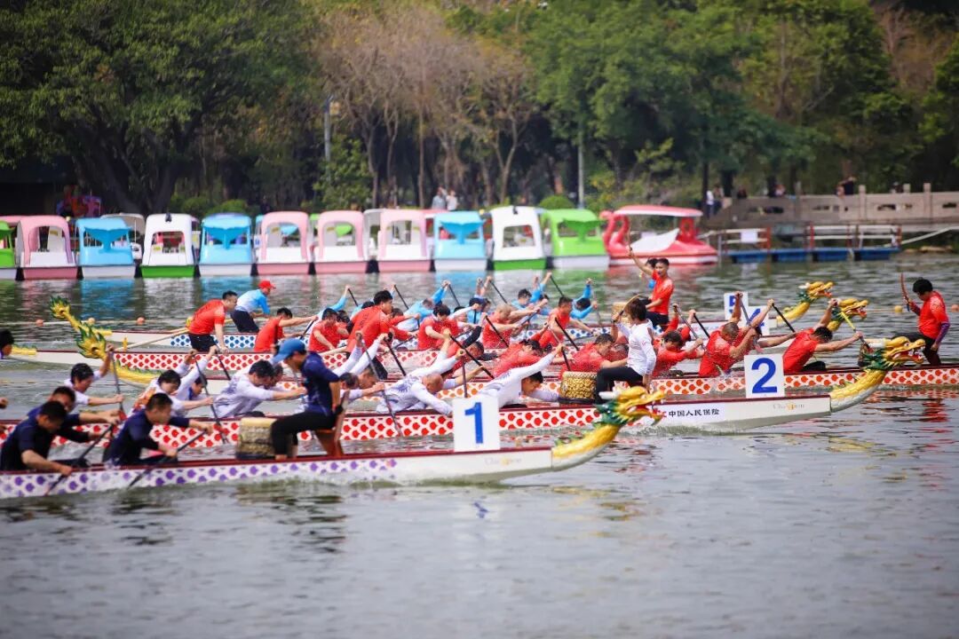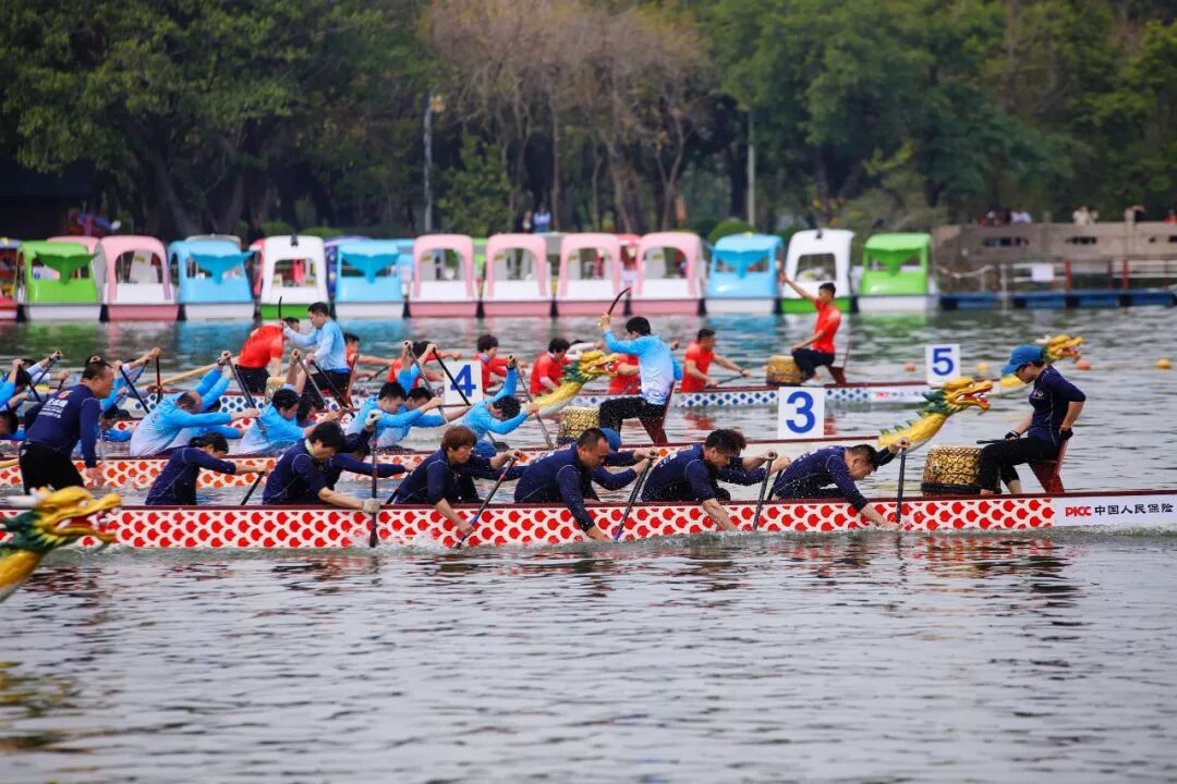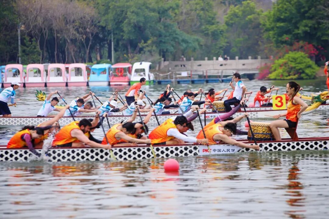 奋楫争先,激战正酣。华阳湖面上,龙舟选手们在赛道中挥桨击水,一条条龙舟你追我赶、劈波斩浪、奋力争先。各支龙舟队伍火力全开,展现出极高的竞技水平和团队精神,欢呼声、呐喊声、尖叫声,环绕华阳湖。