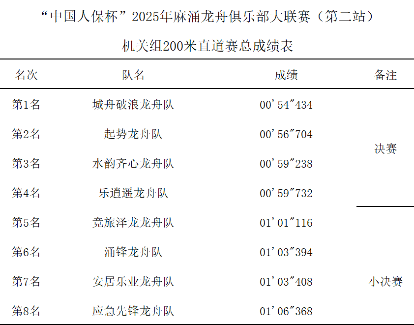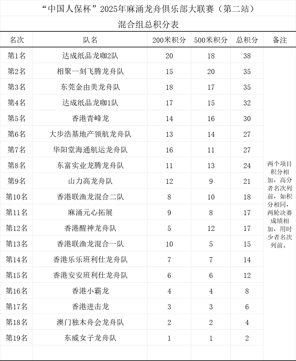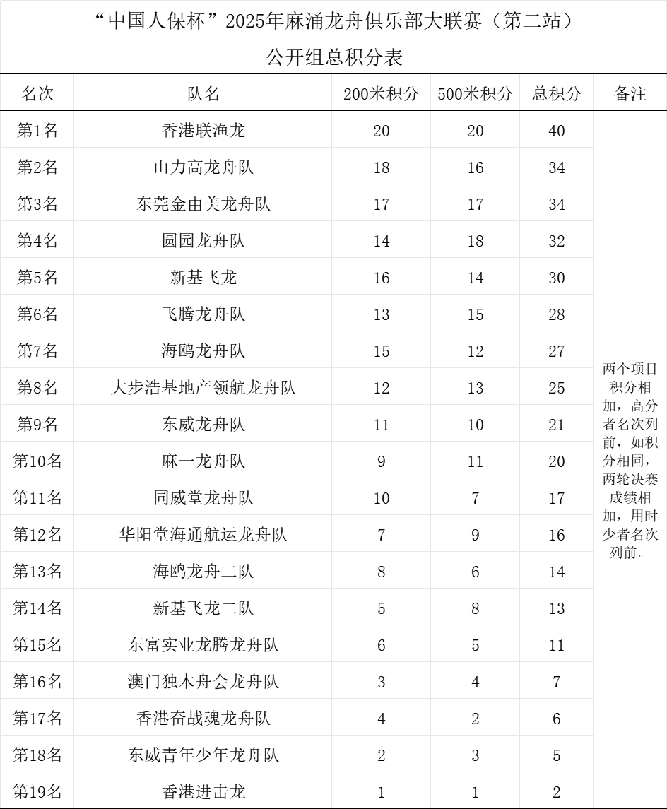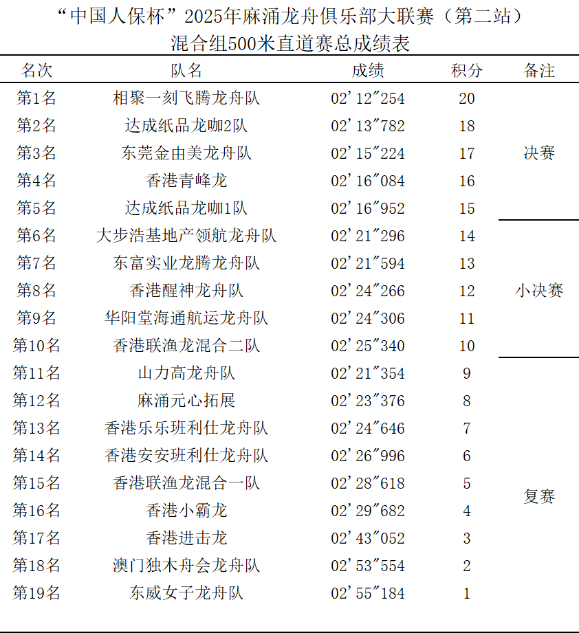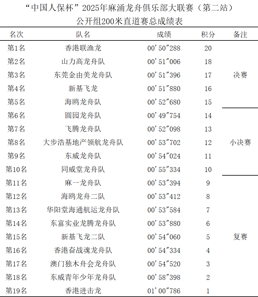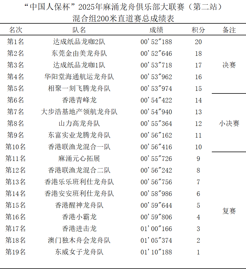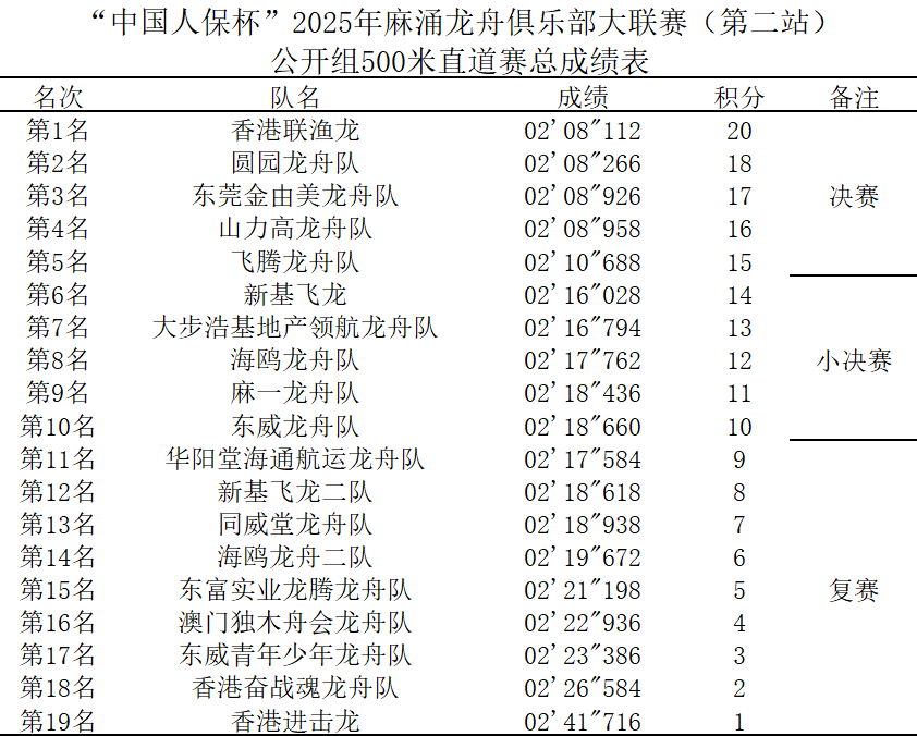 达成纸品龙咖2队获得混合组200米冠军,城舟破浪龙舟队获得机关组200米冠军,香港联渔龙获得公开组200米冠军。相聚一刻飞腾龙舟队获得混合组500米冠军,香港联渔龙获得公开组500米冠军。达成纸品龙咖2队获得混合组总成绩冠军,香港联渔龙获得公开组总成绩冠军。