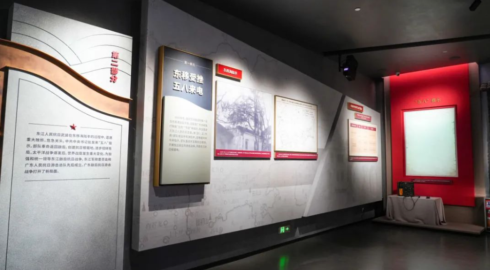 展馆设基本陈列展厅、研学厅、户外外景观区、文创区等。展陈⾯积近1500平方米,分为序厅、主题展陈区和尾厅三个展区,参观流线226米,参观时长40分钟,主要从“南国烽烟举战旗”、“中央指示扭危局”、“伟大营救护文脉”、“亮剑挥戈势如虹”、“北撤南征立新功”五个部分展示了东江纵队在党的领导下,坚持敌后抗战、组建武装的革命抗争历史,彰显了中国人民伟大的抗战精神。