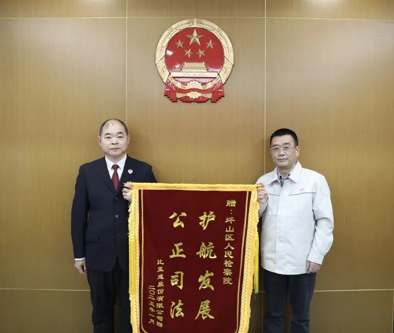 会后,比亚迪集团副总裁刘焕明代表公司向坪山区检察院赠送了“护航发展,公正司法”的锦旗。