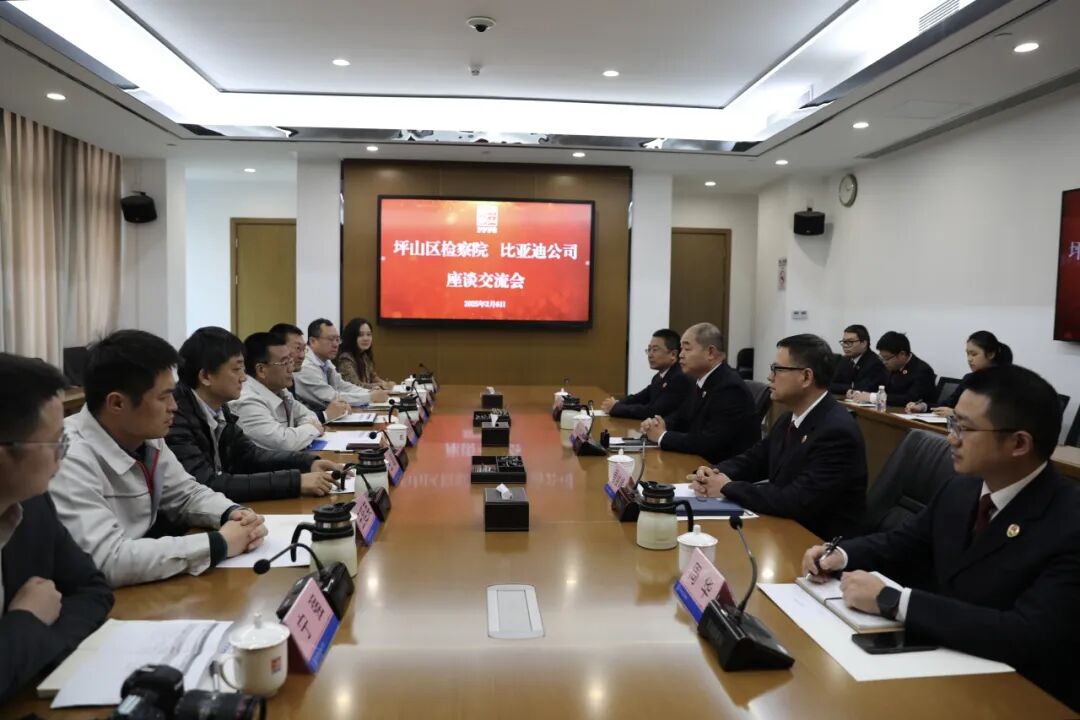 2月6日下午,比亚迪集团副总裁刘焕明一行到坪山区检察院座谈交流并赠送锦旗,表达对检察机关以高质量检察履职护航企业高质量发展的感谢。坪山区检察院党组书记、检察长刘山泉,党组成员、副检察长周俊峰及双方相关部门负责人参加座谈。