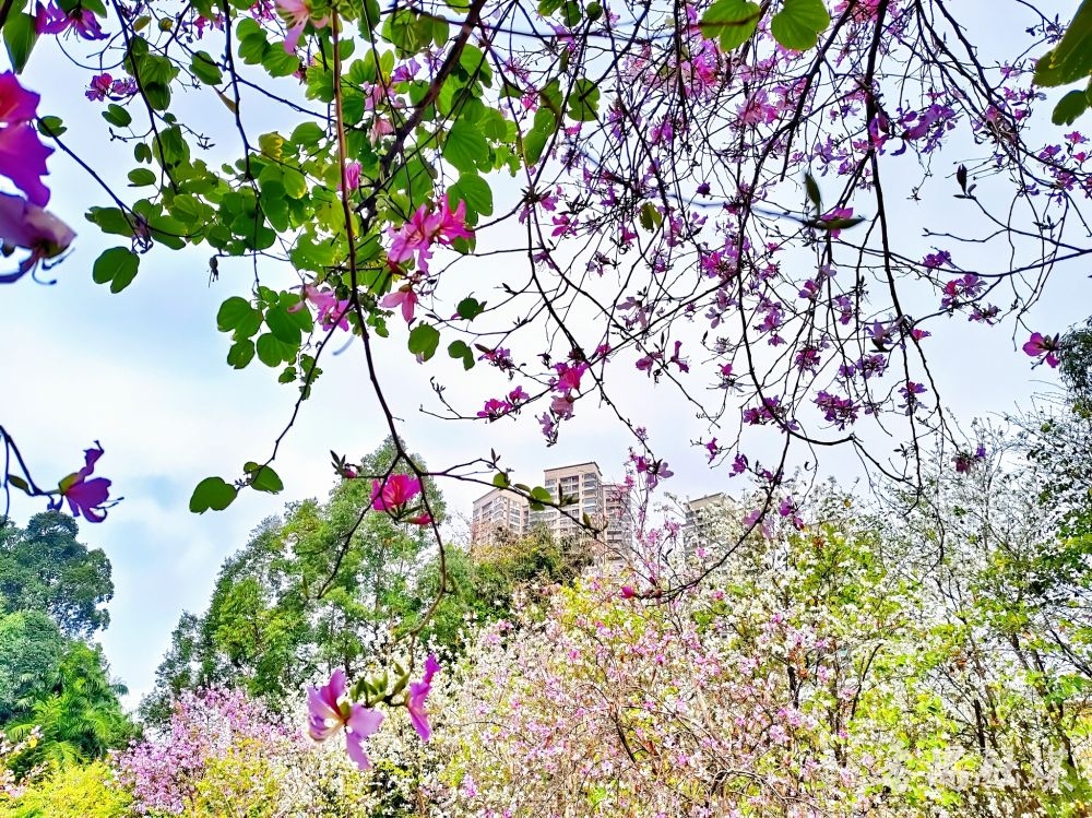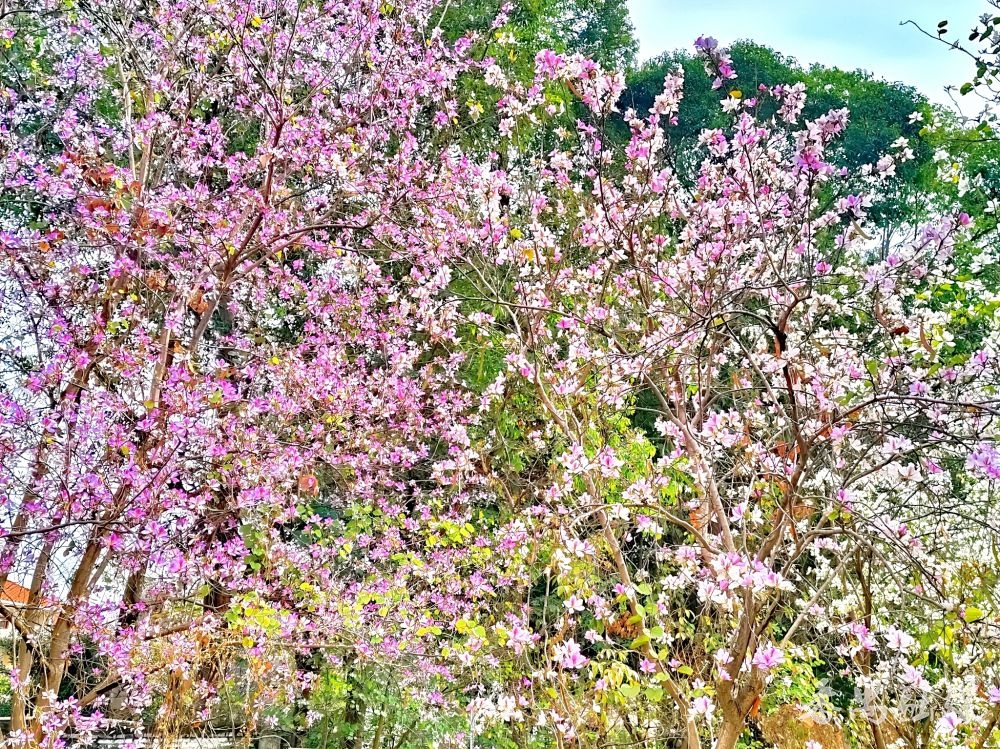 约100棵宫粉紫荆树肆意绽放踏入广场,粉白交织的花海撞入眼帘,让人瞬间沉浸在浪漫氛围中。宫粉紫荆树身姿挺拔,数米高的枝干撑起伞状树冠,繁花簇拥枝头,像一串串精致铃铛。粉色花朵娇艳柔美,白色花朵纯净素雅,相互映衬,尽显浪漫雅致。微风轻拂,花瓣摇曳生姿,淡雅清香飘散开来,令人沉醉、流连忘返。