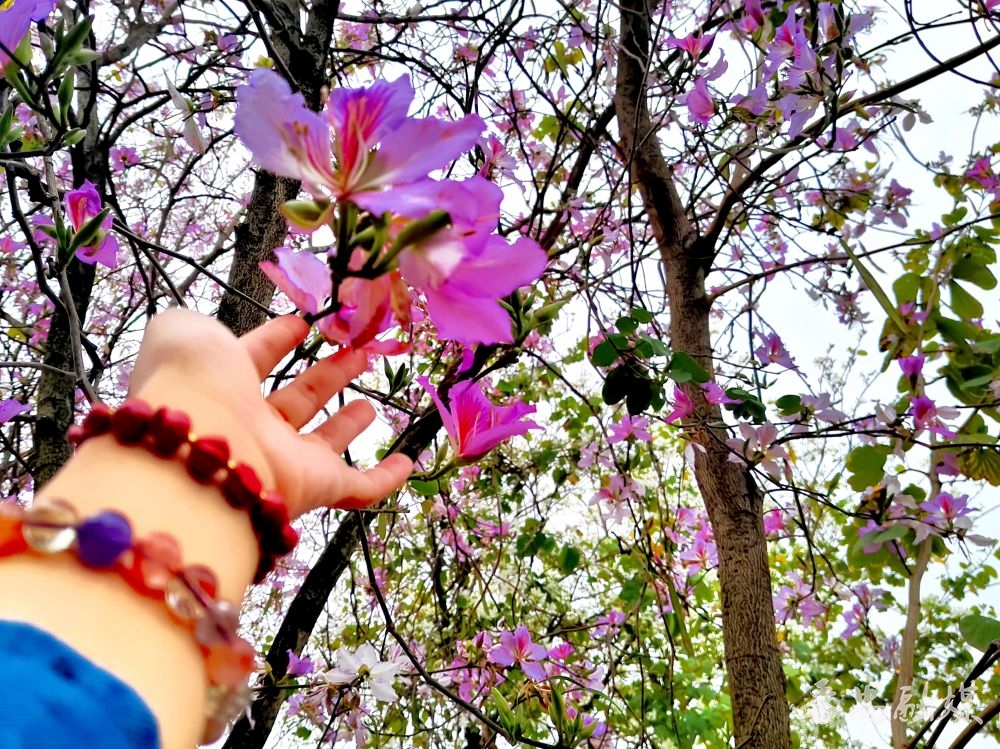 赏花现场,记者采访到了前来打卡的陈小姐。陈小姐兴奋地说道:“我在社交平台上刷到龙腾广场的紫荆花海,一眼就被吸引了,今天专门过来拍照。这里真的太美了,感觉像走进了童话世界。而且广场的布置很贴心,有很多适合拍照的角度,还有休息的地方。这样的美景出现在市桥城区,真的太难得了,希望以后能多一些这样的景观。”