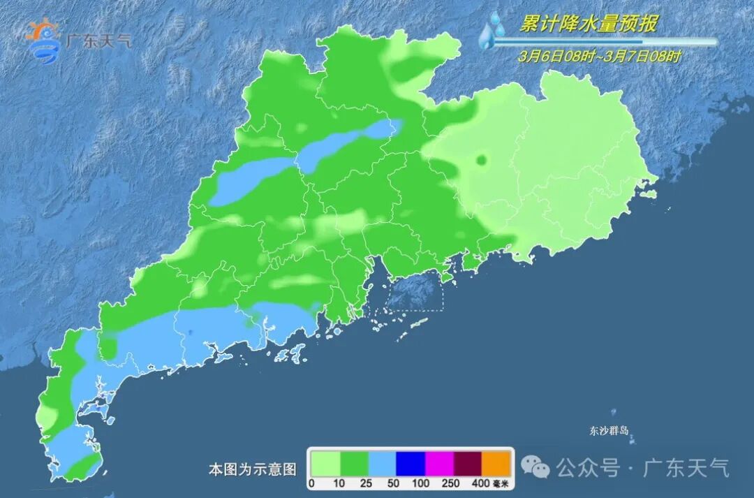 6日,粤西市县阴天有大雨局部暴雨,粤北和珠江三角洲市县有中雨局部大雨,其余市县阴天有小雨。最低气温:粤北市县8~11℃,粤西沿海市县14~16℃,其余市县11~14℃。