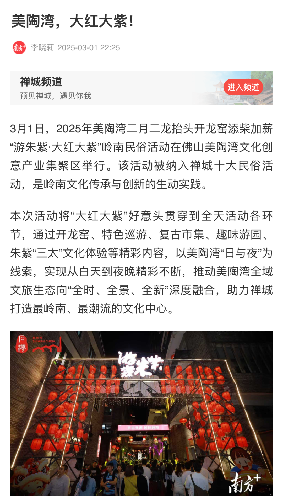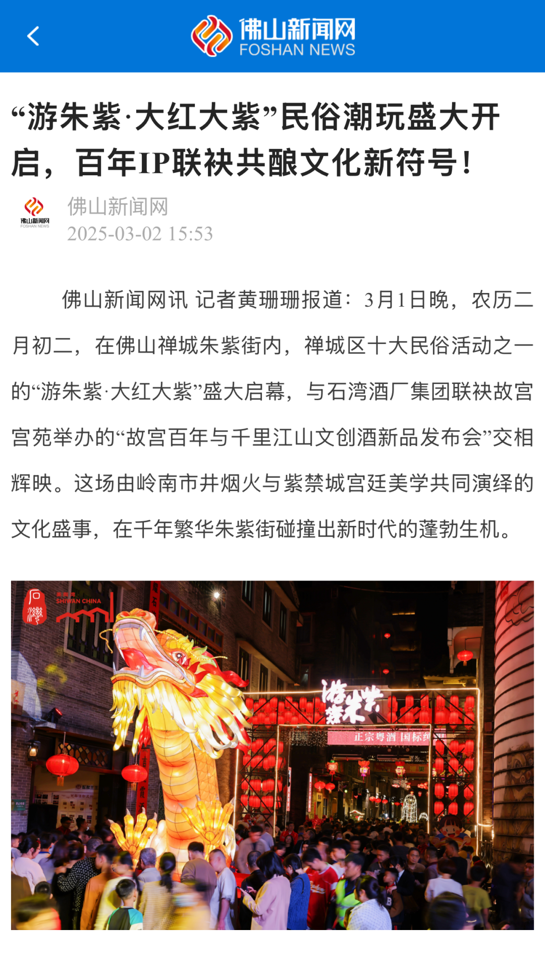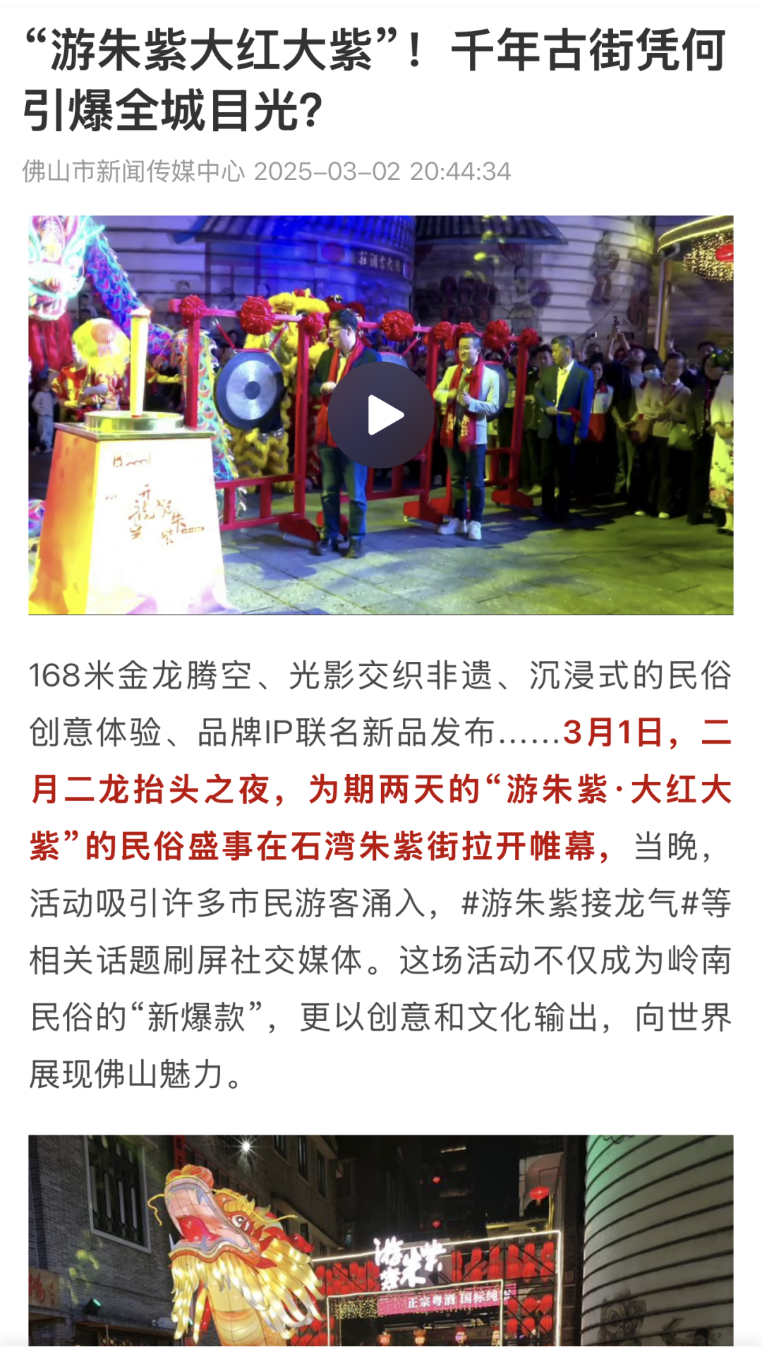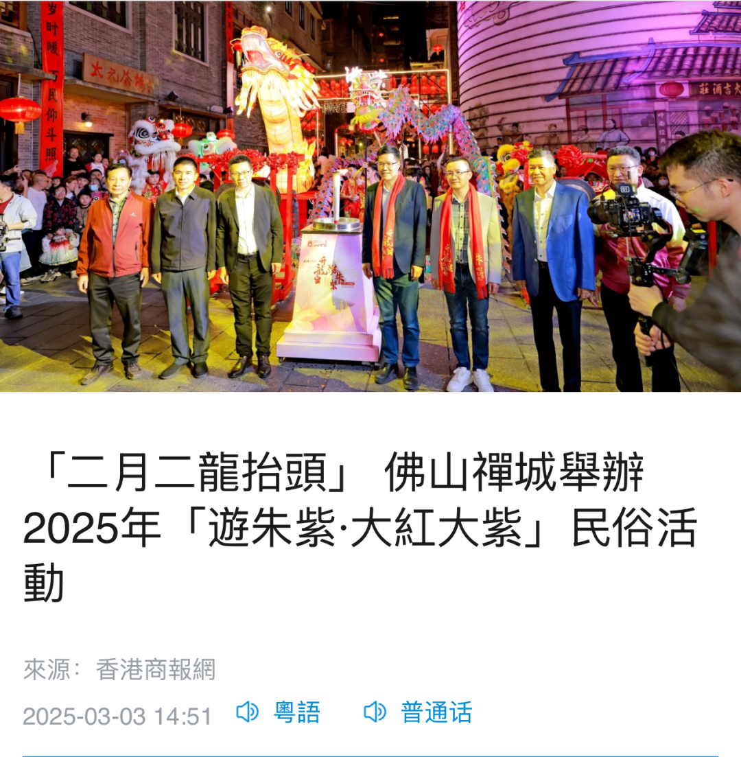 3月1至2日,为期“两夜一天”的“游朱紫·大红大紫”岭南民俗活动暨宋潮雅集在佛山美陶湾朱紫街成功举办。今年的“游朱紫”不仅延续了“行通济保平安,游朱紫求发展”的民俗文化内核,更创新推出“接龙气、摸九子、拜吉星、过金斗”“五路财神聚福”等祈福打卡和互动游戏,并开放“乐酒肆”“孖仔阁”等集美食和特色文化为一体的场所,以民俗文化为纽带,让千年朱紫街焕发时代新辉。