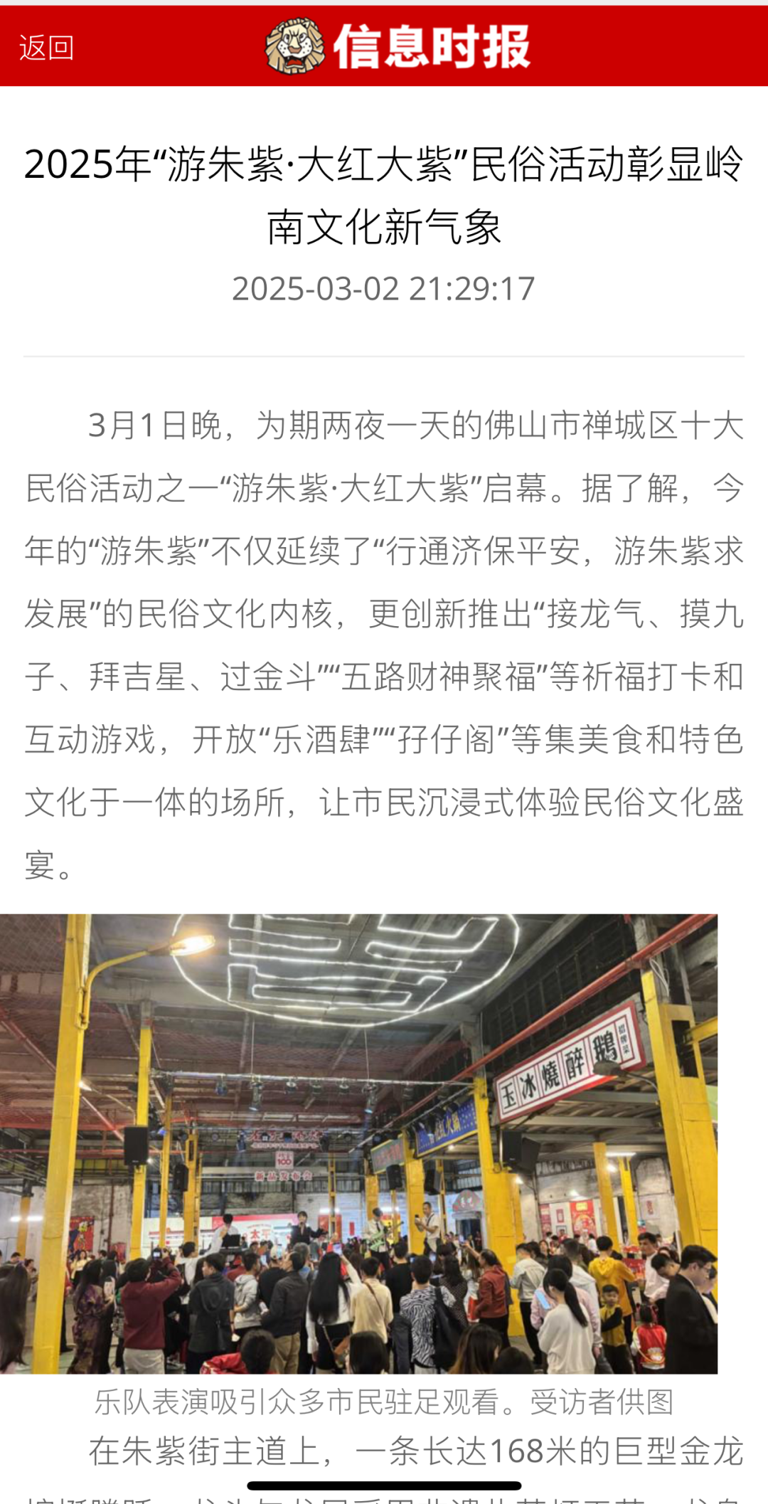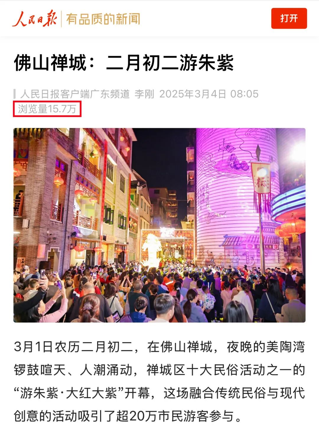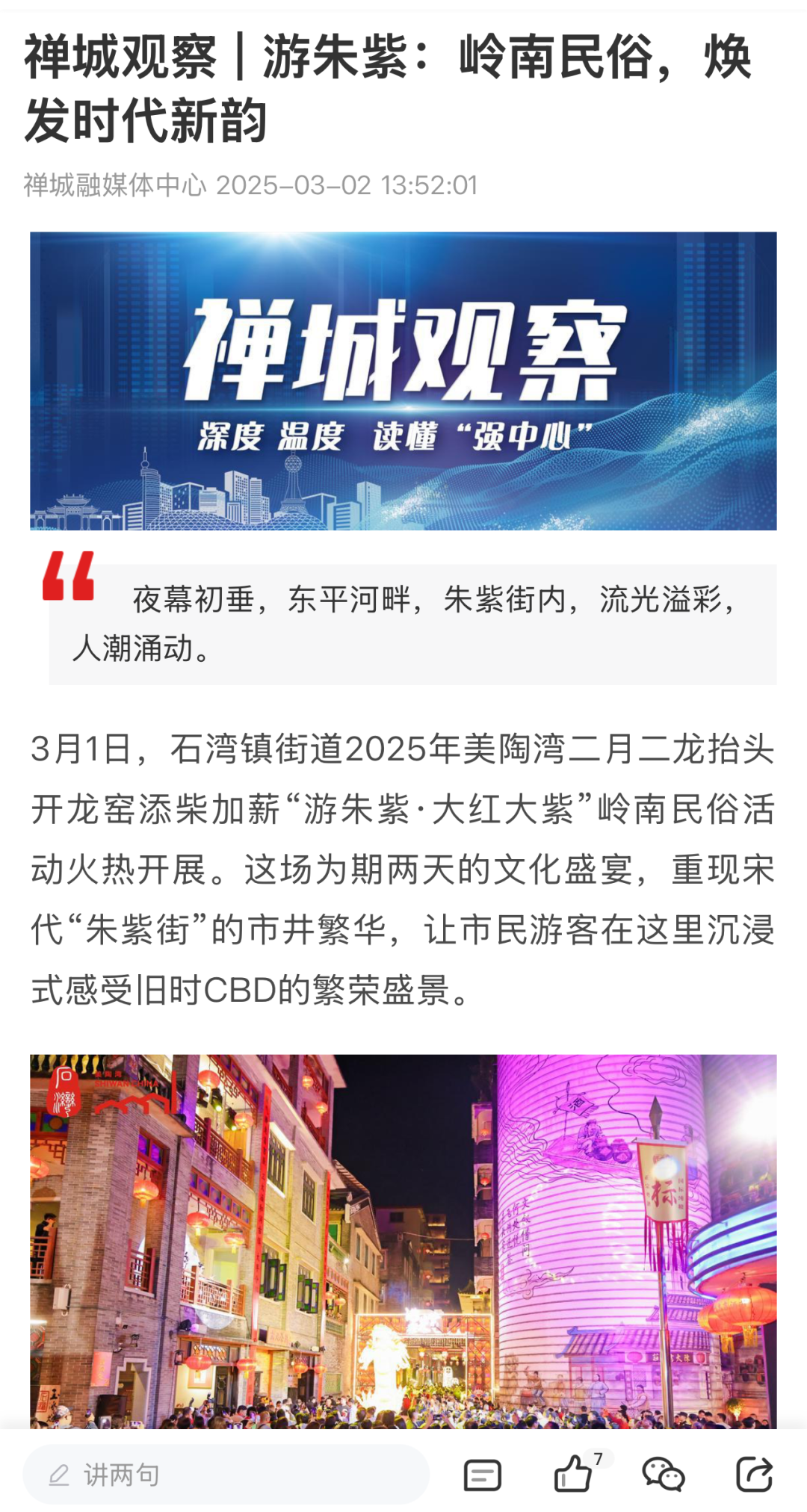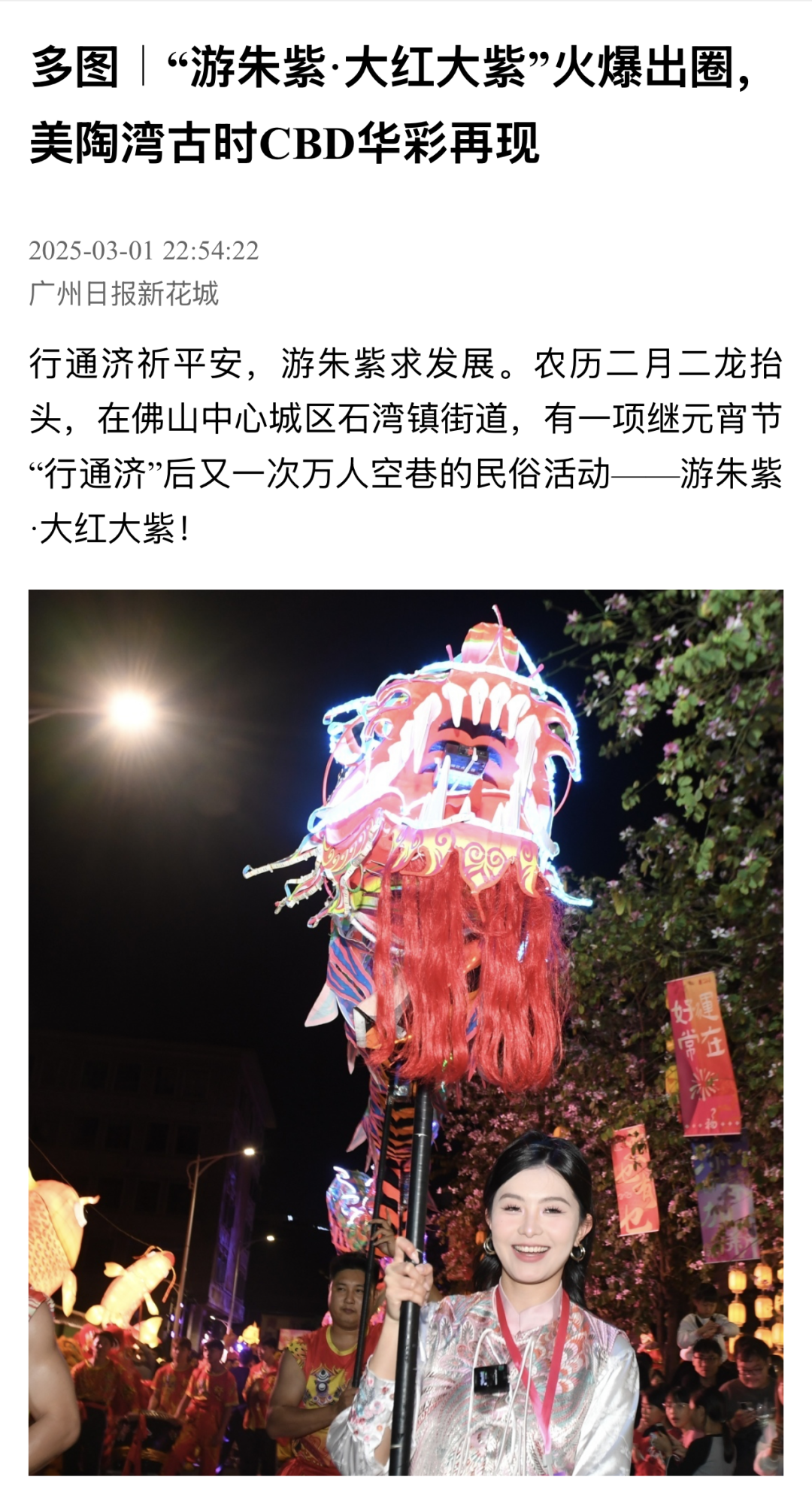 3月1至2日,为期“两夜一天”的“游朱紫·大红大紫”岭南民俗活动暨宋潮雅集在佛山美陶湾朱紫街成功举办。今年的“游朱紫”不仅延续了“行通济保平安,游朱紫求发展”的民俗文化内核,更创新推出“接龙气、摸九子、拜吉星、过金斗”“五路财神聚福”等祈福打卡和互动游戏,并开放“乐酒肆”“孖仔阁”等集美食和特色文化为一体的场所,以民俗文化为纽带,让千年朱紫街焕发时代新辉。