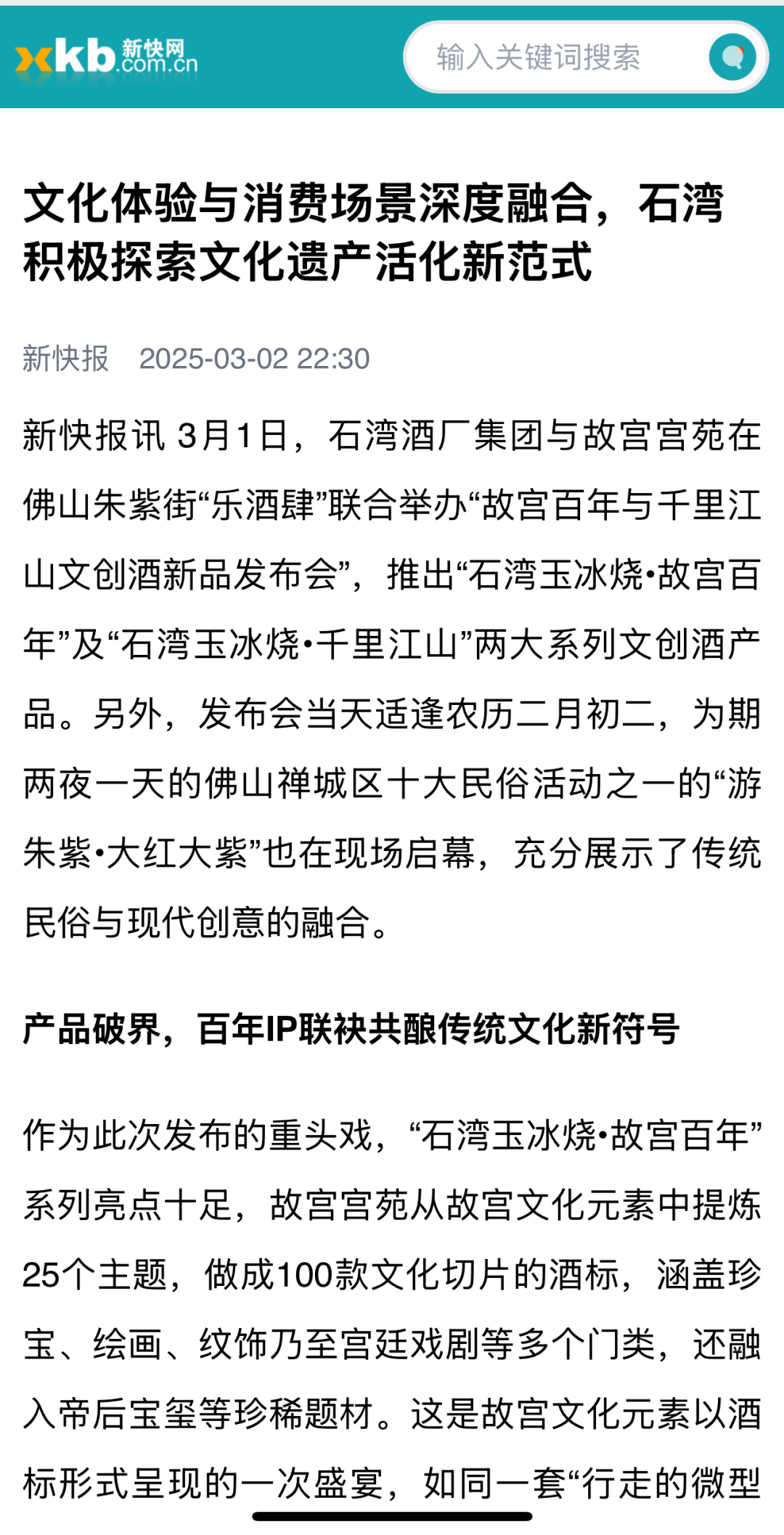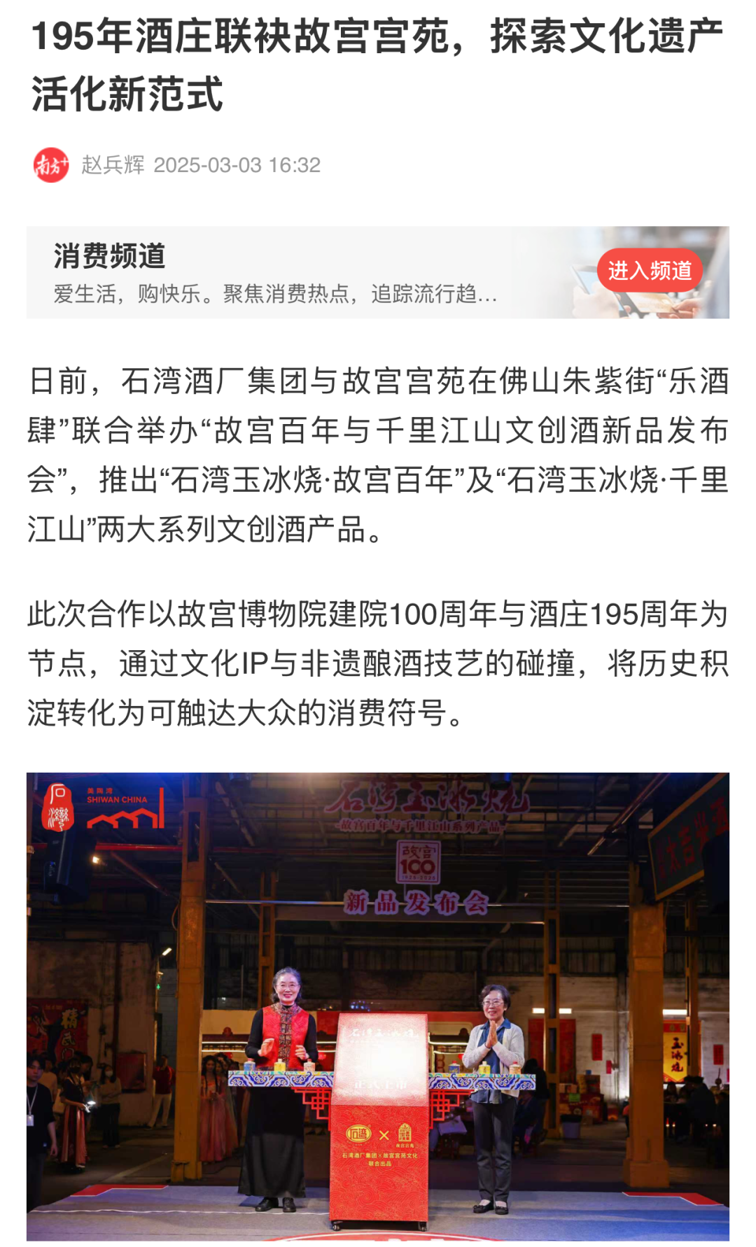 “游朱紫·大红大紫”活动当晚,石湾酒厂集团与北京故宫宫苑联合举办了“故宫百年与千里江山文创酒新品发布会”,推出“石湾玉冰烧·故宫百年”及“石湾玉冰烧·千里江山”两大系列文创酒产品。这场联名合作,不仅是一次文化IP与非遗酿酒技艺的深度碰撞,更是中国酒业与文创界探索文化遗产创新传承的标志性事件,将重新定义“文化酒”的当代价值。