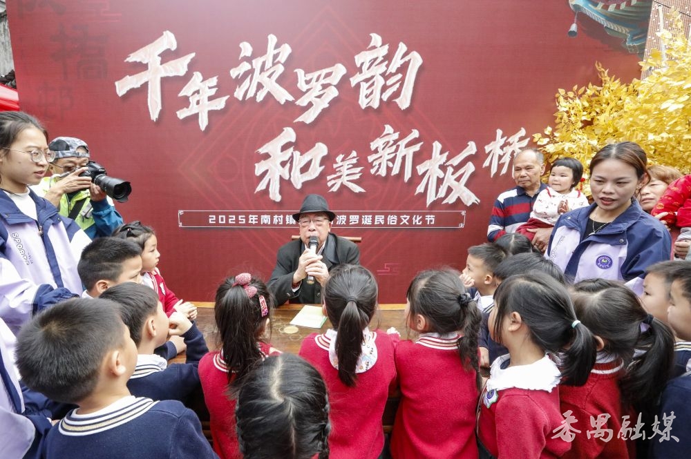 随后,在南海神祠前,广府民俗专家、番禺文化名人梁谋带来了一场别开生面的民俗课堂。在小朋友们的簇拥下,谋叔以浅显易懂、幽默风趣的语言讲述着南海神祝融的传说和板桥村悠久的历史,为听众们揭开了波罗诞神秘的“前世今生”。